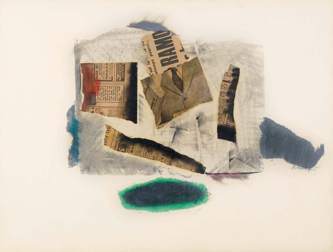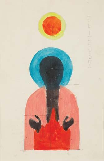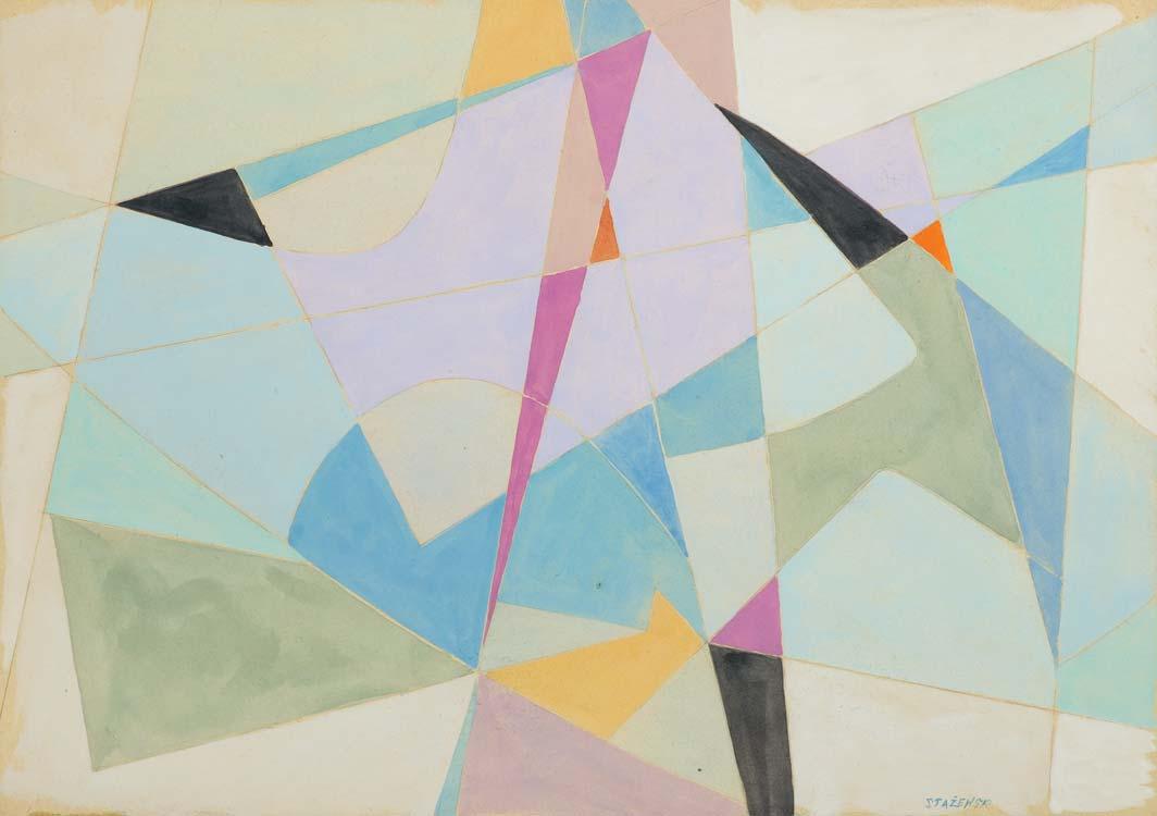 KOMPOZYCJA, lata 70. XX w. technika własna (farby wodne, werniks), papier naklejony na płytę pilśniową 43 x 62 cm (w świetle ramy) sygn. p.d.: Hilary