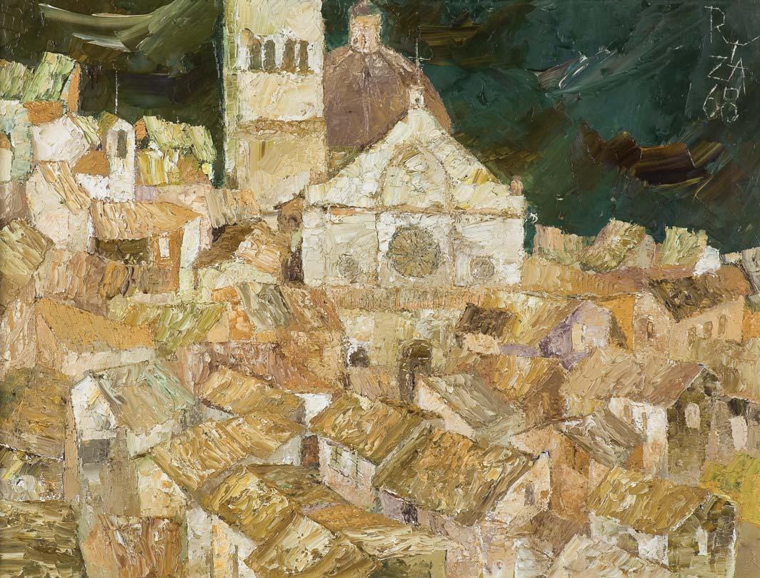 Ulubionym tematem malarstwa Ryszarda Zająca są małe, pełne uroku włoskie miasteczka – takie, jak na prezentowanym obrazie Asyż. W pracach oddających niepowtarzalną architekturę Italii artysta operuje gęsto zestawionymi bryłowatymi formami wiekowych domów o zróżnicowanych fasadach, które piętrzą się ku górze, wypełniając cały kadr obrazu. Rzadkie, zaznaczone jakby szkicowo sylwetki przechodniów są jedynie uzupełnieniem całej architektonicznej kompozycji.