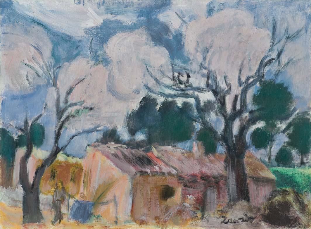 PEJZAŻ Z DOMEM, lata 40. XX w. olej, płótno, 54 x 73 cm sygn. p.d.: Zawado Na odwrocie na ramie kartka z notatkami ramiarskimi.