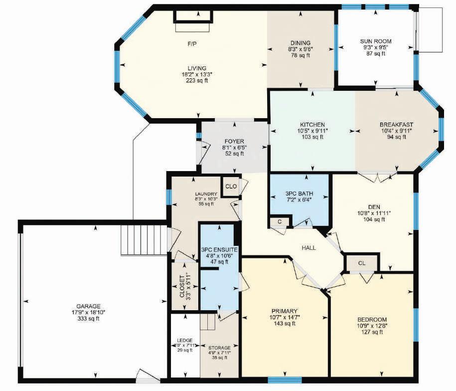 Room Level Dimensions Dimensions (Metric) Room Features Living Room Main 18’ 2” X 13’ 3” 5.54 X 4.04 Dining Room Main 9’ 6” X 8’ 3” 2.90 X 2.51 Sunroom Main 9’ 5” X 9’ 3” 2.87 X 2.82 Kitchen Main 10’ 5” X 9’ 11” 3.17 X 3.02 Breakfast Room Main 10’ 4” X 9’ 11” 3.15 X 3.02 Den Main 11’ 11” X 10’ 8” 3.63 X 3.25 Bedroom Main 12’ 8” X 10’ 9” 3.86 X 3.28 Bathroom Main 7’ 2” X 6’ 4” 2.18 X 1.93 3-Piece Bedroom Primary Main 14’ 7” X 10’ 7” 4.44 X 3.23 Primary Ensuite Bathroom Main 10’ 6” X 4’ 6” 3.20 X 1.37 3-Piece Laundry Main 10’ 3” X 8’ 3” 3.12 X 2.51 Bedroom Lower 14’ 0” X 12’ 7” 4.27 X 3.84 Bedroom Lower 12’ 7” X 9’ 2” 3.84 X 2.79 Kitchen Lower 12’ 0” X 9’ 1” 3.66 X 2.77 Bathroom Lower 7’ 2” X 6’ 4” 2.18 X 1.93 2-Piece Living Room Lower 24’ 5” X 12’ 2” 7.44 X 3.71 Laundry Lower 9’ 3” X 7’ 2” 2.82 X 2.18 Bathroom Lower 9’ 4” X 7’ 10” 2.84 X 2.39 4-Piece Utility Room Lower 9’ 7” X 8’ 6” 2.92 X 2.59