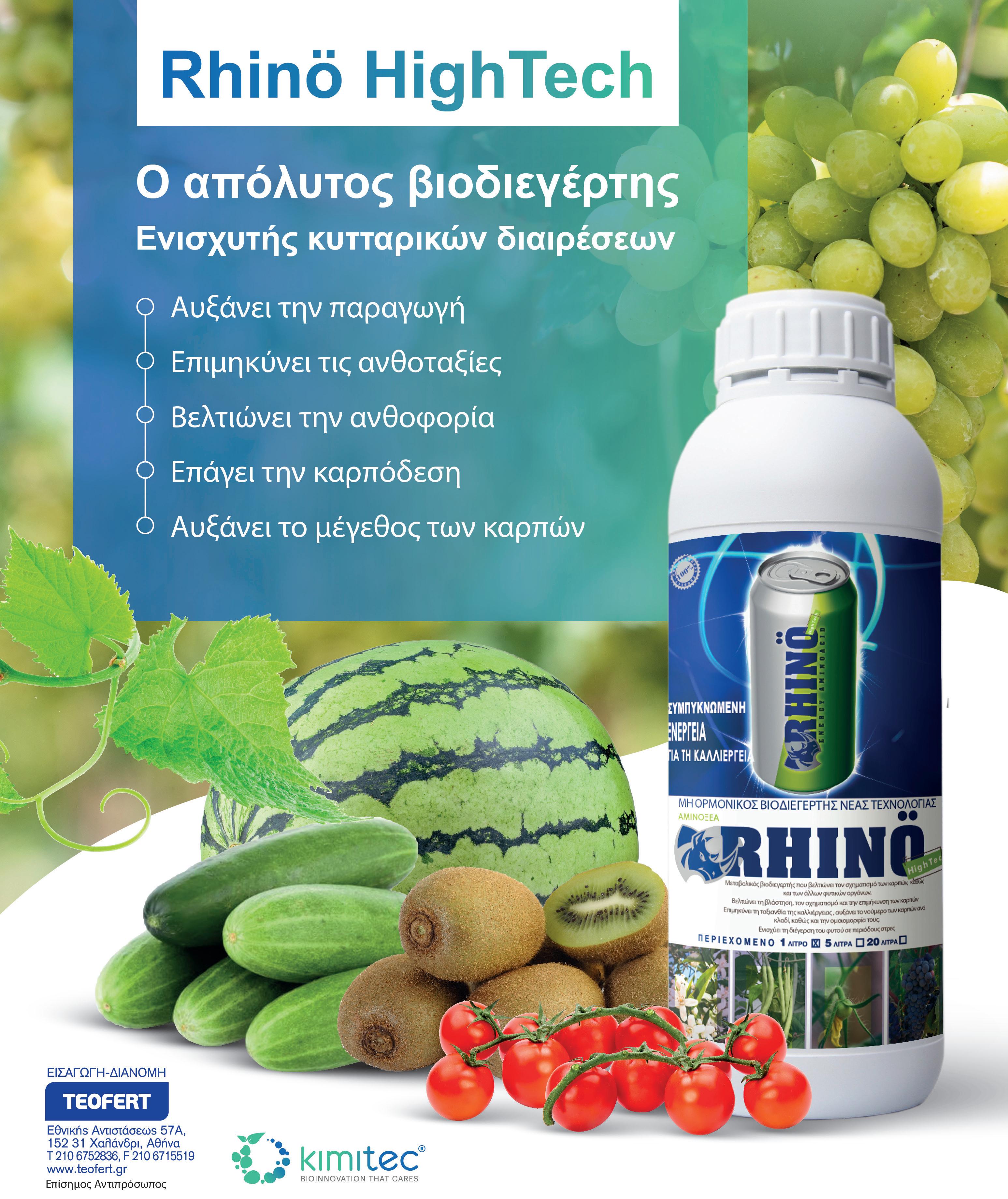 Η KIMITEC με αιχμή την έρευνα και ανάπτυξη και με τη βοήθεια της τεχνολογίας για βελτιστοποίηση των μέσων παραγωγής, παρουσιάζει εξειδικευμένες λύσεις για τους παραγωγούς για την ενίσχυση όλων των φαινολογικών σταδίων με σκοπό την αύξηση των αποδόσεων. Ένα απο τα κρισιμότερα στάδια της καλλιέργειας με άμεσο αντίκτυπο στη παραγωγή είναι αυτό της καρπόδεσης αλλά και των κυτταροδιαιρέσεων που συντελούνται κατά τα αρχικά στάδια της ανάπτυξης των καρπών, καθώς αυτές είναι άμεσα υπέυθυνες για το τελικό μέγεθός τους. Σε αυτό το σημείο, η KIMITEC προσφέρει τη λύση για το παραγωγό με ένα επαναστατικό, μη ορμονικό βιοδιεγέρτη, το RHINÖ ΗΤ. RHINÖ ΗΤ Το RHINÖ ΗΤ είναι ένας ισχυρός βιοδιεγέρτης ειδικά σχεδιασμένος για τη βελτίωση όλων των μεταβολικών και ενζυματικών διαδικασιών που στοχεύουν στην καλύτερη καρπόδεση αλλά και στην κυτταροδιαίρεση μέσα στο φυτό, στο μέγιστο των γενετικών του δυνατοτήτων.