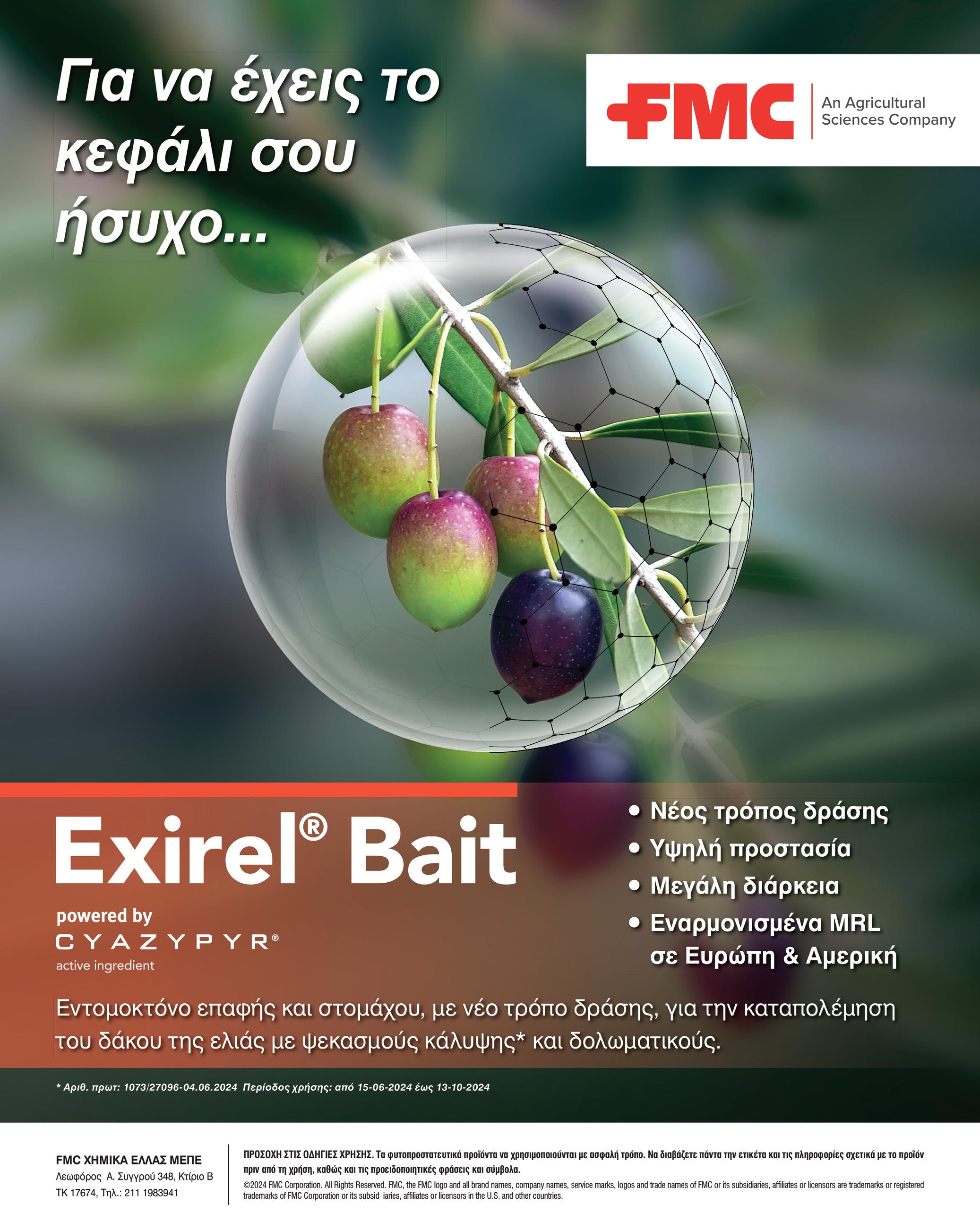 ενάντια στο δάκο, Exirel® Bait από την FMC Ελλάς Το καινοτόµο εντοµοκτόνο Exirel® Bait, της FMC Ελλάς αποτελεί πλέον µία νέα και αξιόπιστη λύση για την αντιµετώπιση του δάκου στην ελιά, του σηµαντικότερου εντοµολογικού εχθρού της ελαιοκαλλιέργειας, που προκαλεί ζηµιές ανυπολόγιστου κόστους. Ύστερα από αρκετά χρόνια, έχουµε µια νέα χηµική οµάδα για την καταπολέµηση του δάκου. Η δραστική ουσία του Exirel® Bait, το Cyantraniliprole®, επιδεικνύει ένα νέο και µοναδικό τρόπο δράσης, επιδρώντας στο µυϊκό σύστηµα των εντόµων µε τη µη ελεγχόµενη έκλυση ασβεστίου. Λόγω της µυϊκής παράλυσης, επέρχεται άµεση παύση της διατροφής, δυσλειτουργία της κίνησης του εντόµου και το πιο σηµαντικό, αδυναµία της αναπαραγωγικής ικανότητας - ωοθεσίας και άρα της δακοπροσβολής και τελικά θανάτωση. Το εντοµοκτόνο Exirel® Bait έχει λάβει οριστική έγκριση κυκλοφορίας για δολωµατικούς ψεκασµούς και κατ’ εξαίρεση έγκριση για ψεκασµούς καλύψεως για το δάκο της ελιάς. Το εντοµοκτόνο Exirel® Bait, έχοντας ειδικά σχεδιασµένη µορφή (Γαλακτώδες Αιώρηµα, SE), διαθέτει ισχυρή, τοπικά διασυστηµατική κίνηση, καταπολεµώντας εξίσου καλά ακµαία και προνύµφες του δάκου όλων των σταδίων (L1, L2, L3). Επιπλέον, επιδρά στην ικανότητα ωοθεσίας του εντόµου, (όχι δακοπροσβολές), όπως επίσης και στην µεταµόρφωση της νύµφης σε ακµαίο και ολοκλήρωση της ανάπτυξης του τέλειου, (αποτελεσµατικός έλεγχος επόµενης γενιάς). Μέγιστος αριθµός εφαρµογών ανά καλλιεργητική περίοδο: Τρεις στο δολωµατικό ψεκασµό και δύο στον ψεκασµό καλύψεως, ενώ αν γίνει συνδυασµός των δύο µεθόδων, τότε πρέπει να γίνονται το πολύ τρεις εφαρµογές συνολικά. Η οδηγία, όσον αφορά τον αριθµό εφαρµογών, πρέπει να τηρείται σχολαστικά για τη σωστή διαχείριση της ανθεκτικότητας. Για τη δραστική ουσία του Exirel® Bait (Cyantraniliprole®) υπάρχουν θεσµοθετηµένα MRLs, όσον αφορά τα υπολείµµατα σε Ευρώπη, Ην. Πολιτείες και άλλες χώρες, σε ελαιόλαδο και ελαιόκαρπο. Τα MRLs σε ΕΕ και ΗΠΑ είναι 3 ppm. Συµπερασµατικά, η καινοτόµος τεχνολογία, (µε πολλαπλό τρόπο δράσης ενάντια στο δάκο), του εντοµοκτόνου Exirel® Bait, λειτουργεί ως ένα δυναµικό «εργαλείο» για τον Έλληνα παραγωγό. ΚΟΛΙΟΠΟΥΛΟΣ ΓΙΩΡΓΟΣ, MSC, MBA ΓΕΩΠΟΝΟΣ, MARKETING SPECIALIST Ν. ΕΛΛΑ∆ΑΣ, FMC ΧΗΜΙΚΑ ΕΛΛΑΣ στροφές ανά λεπτό, τα Dorado 95 και 105 αποδίδουν µέγιστη ισχύ 95 και 106 HP αντίστοιχα στις 2000 σαλ. και µέγιστη ροπή 389 και 433 Nm στις 1400 σαλ. Αυτές οι τιµές, σε συνδυασµό µε το κατά κανόνα µικρό βάρος των Dorado, προσφέρουν βέλτιστη αναλογία ισχύος προς βάρος, καθιστώντας αυτούς τους ελκυστήρες ιδανικούς για σπορά, φροντίδα των καλλιεργειών ή για εφαρµογές όπου απαιτείται ισχύς αλλά ταυτόχρονα είναι απαραίτητο να αποφεύγεται η συµπίεση του εδάφους. Συνδυασµοί για το κιβώτιο ταχυτήτων Οι διάφοροι διαθέσιµοι συνδυασµοί για το κιβώτιο ταχυτήτων βασίζονται όλοι σε ένα σύστηµα µε 5 ταχύτητες και OverSpeed, το οποίο επιτρέπει στο τρακτέρ να κινείται µε 40 km/h µε οικονοµικές στροφές του κινητήρα. Η βασική έκδοση 30+15 ταχυτήτων περιλαµβάνει ένα creeper mode (αργή ταχύτητα, ‘έρπειν’) και επιτρέπει στο τρακτέρ να κινείται µε µόλις 240 µέτρα ανά ώρα µε τη µικρότερη σχέση µετάδοσης και τον κινητήρα στις µέγιστες στροφές. Για τους πιο απαιτητικούς, διατίθεται η έκδοση Powershift, η οποία αυξάνει το συνολικό αριθµό ταχυτήτων σε 45+45, ενώ µειώνει επίσης την ταχύτητα «έρπειν» στα 200 m/h µε τη µικρότερη σχέση και τον κινητήρα στις µέγιστες στροφές. Και τα δύο κιβώτια είναι διαθέσιµα µε µια πρακτικ