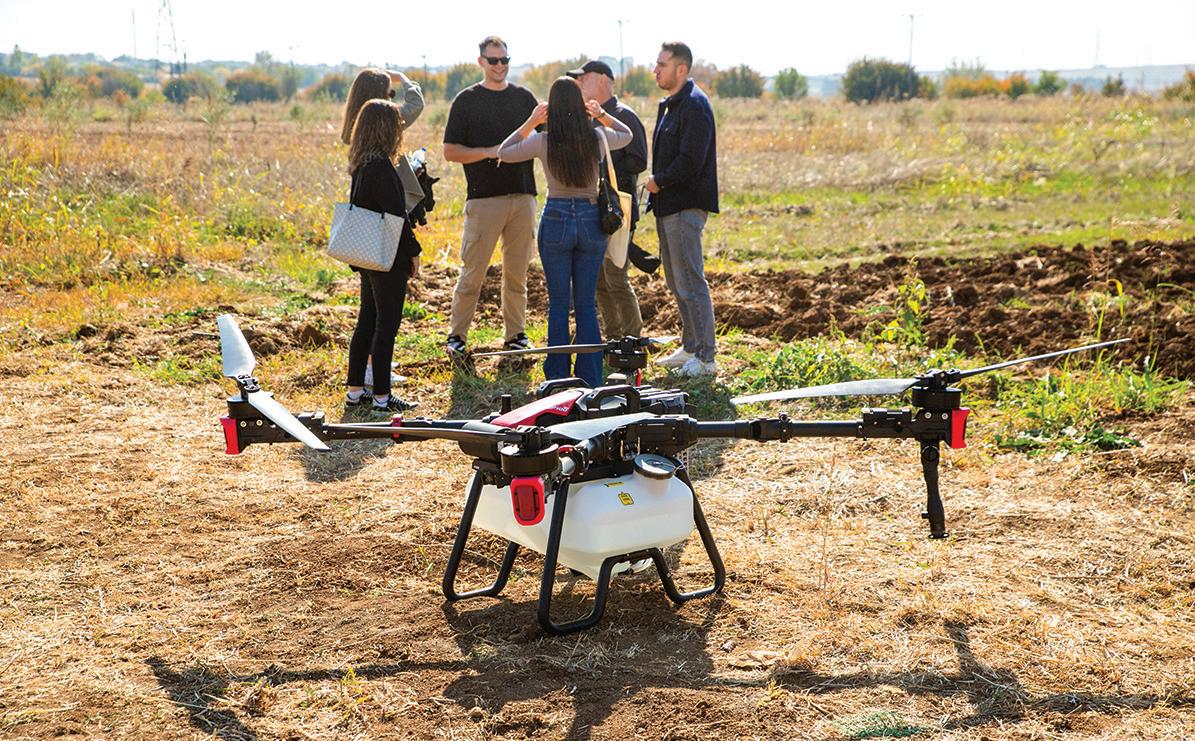 Μηλιώτης υπεύθυνος τµήµατος Γεωργίας Ακριβείας της εταιρείας, µε χειριστές τους Γιώργο Κωτσιόπουλο και Σιδέρη Γκαβλαρούδη. Το drone αυτό διαθέτει δεξαµενή 40 λίτρων, τέσσερις βραχίονες και ειδικά για την επίδειξη είχε κιτ για δέντρα, και τέσσερα περιστροφικά µπεκ που µπορούν να φτάσουν την σταγόνα από 50 έως και 500 µικρόµετρα. Πριν από την παρουσίαση