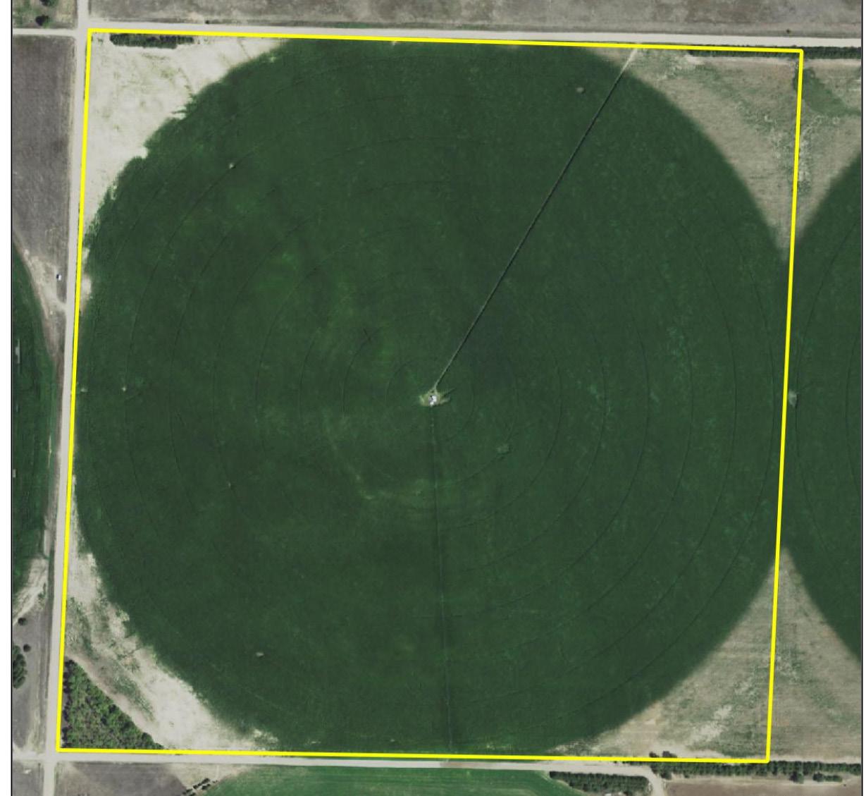 LAND USE: Primarily irrigated cropland with dry cropland corners and a small tract of grass/trees.