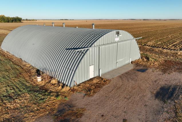 8,174 sq. ft. metal Quonset with 430 ft of portable concrete fenceline bunk and an older grain storage facility that includes four metal bins.