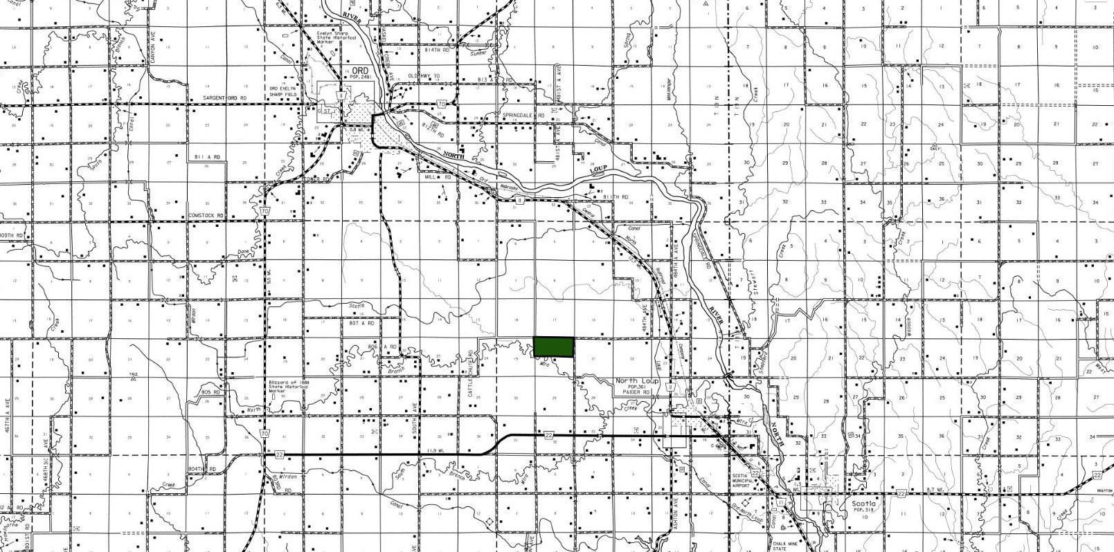 LOCATION: Approximately 5 miles south and 4 miles east of Ord, Nebraska or approximately 2 miles south and 3 miles west of North Loup, Nebraska. Access is provided by gravel Road 482, bordering the east, and minimum maintenance Road 807, bordering the north.