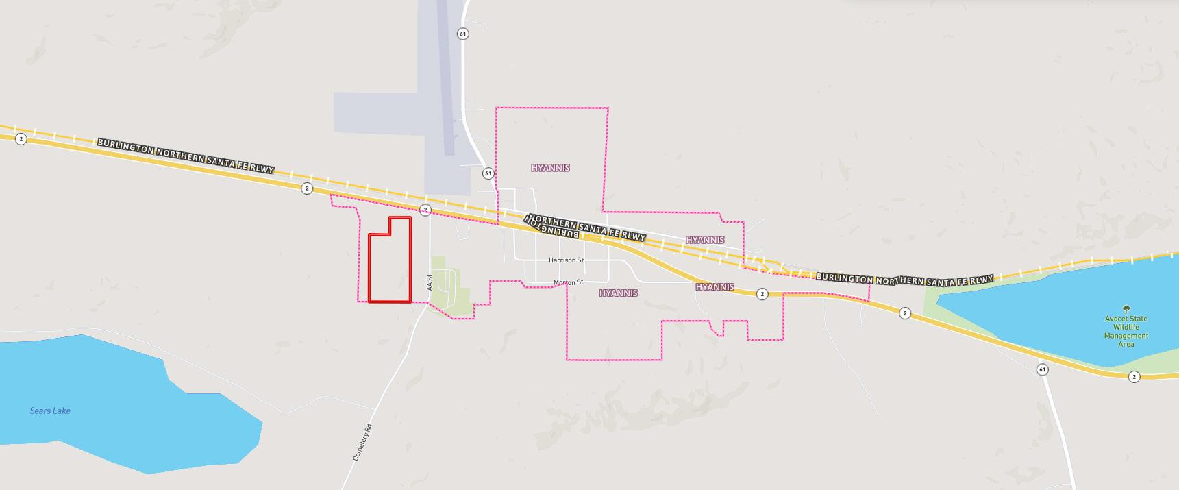 West side of Hyannis, Nebraska on the south side of Hwy 2
