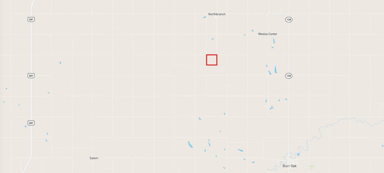 LOCATION: From Burr Oak, Kansas: 4 miles north on Highway 128, then 4 miles west on Z Road, then 1/2 mile north on 75th Road, to the southwestern corner of the property. Or directly 2 miles south of North Branch, Kansas, on 78th Road to the northeastern corner of the property.