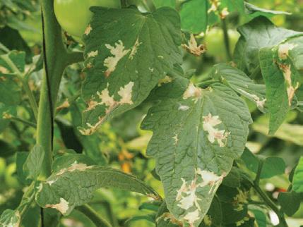 - Les symptômes caractéristiques d’une attaque sont les mines avec des larves vivantes au niveau des jeunes feuilles et des jeunes pousses. - Il est recommandé de faire tous les 7 jours, un comptage des plants infestés; - Le comptage doit se faire avant le passage de l’équipe de nettoyage ; - Le niveau d’attaque doit conditionner le renforcement des équipes de nettoyage et des interventions chimiques de correction, - Le niveau de tolérance peut être plus élevé selon le degré d’installation des auxiliaires sur la culture.