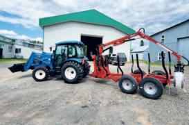 Chargeuse UX713, mât de 13 pi, capac. de levage jusqu'à 2 100 lb, rotation de la flèche de 300°, clame rotative continue. Remorque de 12 pi, pattes basculantes, pôle télescopique pivotante et poteaux mobiles et pivotants, capac. totale de 15 000 lb. Tracteur LS MT468C, 68 HP, pelle de 78 po, capac. de levage de 2 739 lb. Treuil en option.