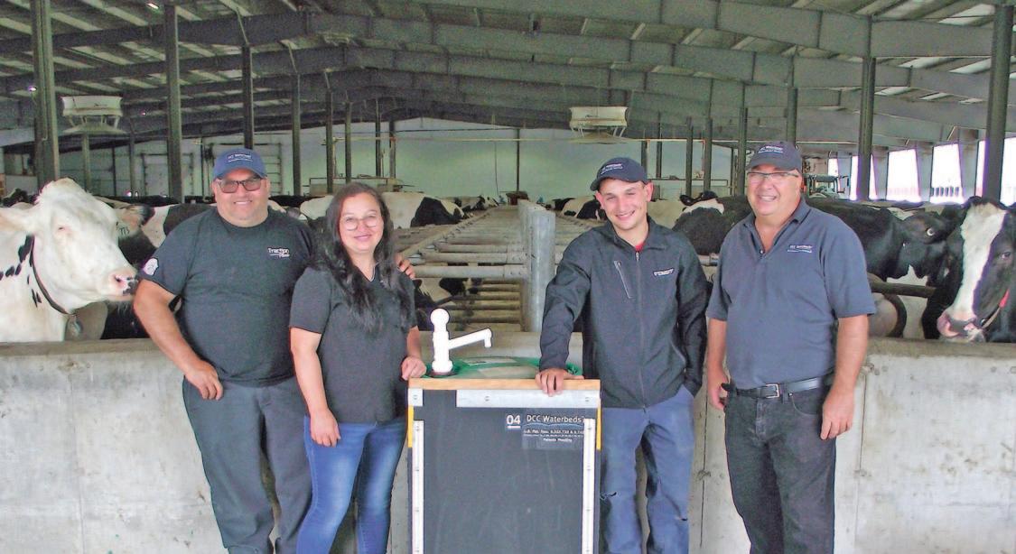 Francis Bélanger, Nathalie Dumont et Vincent Bélanger, de la Ferme du Petit 5 inc., en compagnie de Sylvain Léger, de Distribution S. Léger, distributeur des matelas d’eau DCC Waterbeds