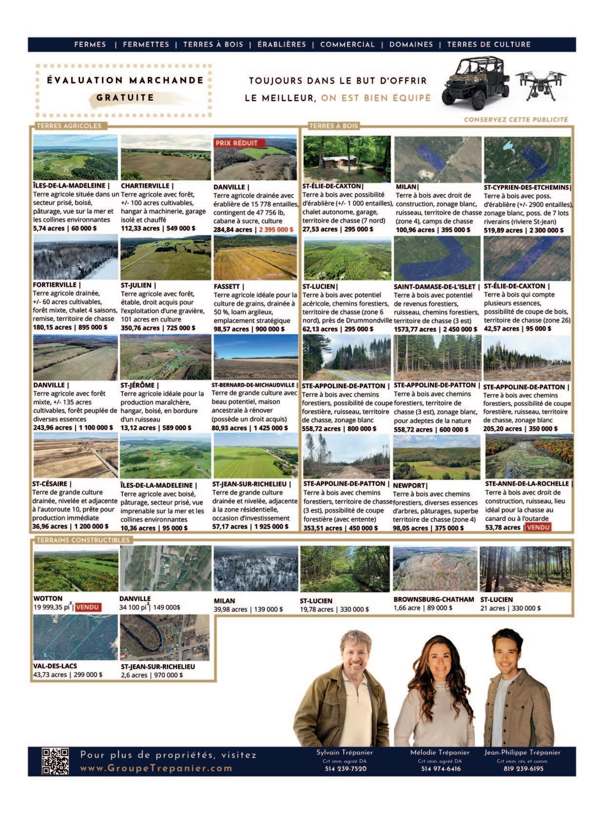 Cette propriété comprend une grange (bâtiment de service) et un aménagement pour bovins (dalle de béton avec allée jusqu’au bâtiment, bols chauffés, panneaux brise-vent). 120 acres (70 drainés et 50 boisés, dont possibilité d’érablière). Accès facile près de l’autoroute 50. Prix : 959 000 $ + taxes