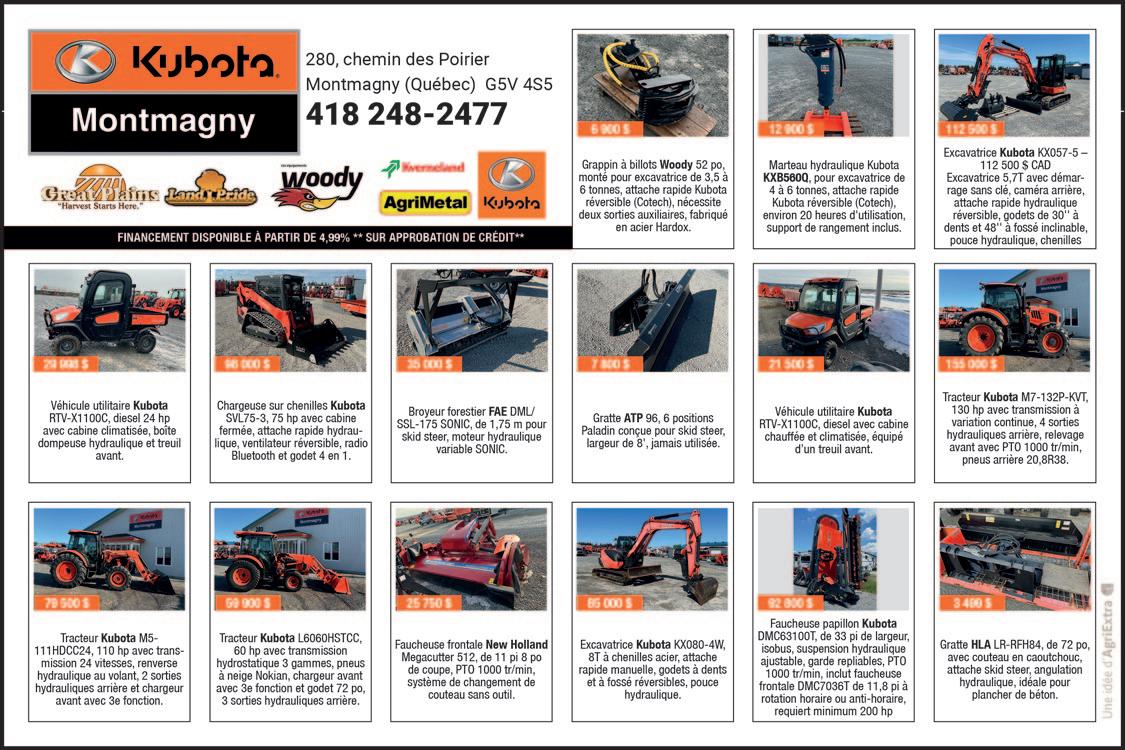 , démonstrateur, 5.5 m 63 950 $ Presse à balles carrées New Holland 316, avec lance balle, très propre. Grand inventaire de remorque dompeuse Miro, appelez-nous pour information!