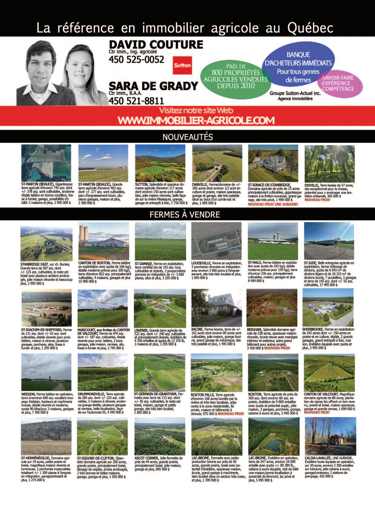 Cookshire-Eaton : Ferme laitière de 140 hectares dont 72 ha en culture. Résidence, grange étable pour 70 vaches, plusieurs silos et bâtiments fonctionnels. Quota laitier de 45,45 kg.