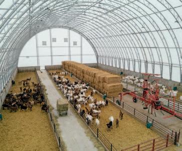 C’est dans ce contexte que Caprijol a décidé d’installer deux dômes Britespan sur sa ferme, un choix qui re昀ète parfaitement son approche agricole. En 2022, un premier dôme du modèle Apex, de 60 x 104 pieds, a été érigé pour l’entreposage de 1 500 balles de paille. Bâti sur des blocs de béton et un fond de gravier, ce premier bâtiment o昀re une capacité d’entreposage impressionnante, permettant de sécuriser les besoins annuels du troupeau. Épatés par ce premier projet, un deuxième dôme du modèle Atlas de 80 x 144 pieds est installé a昀n d’accueillir 600 chevrettes. Cette structure o昀re aux animaux un grand parc lumineux, spacieux et confortable, où ils béné昀cient d’une qualité de vie optimale dans un environnement où les normes de bien-être animal sont placées au cœur des priorités. Sans mécanismes dispendieux et complexes, ces infrastructures répondent parfaitement aux besoins de simplicité et de faible coût de la ferme. Elles transfor-