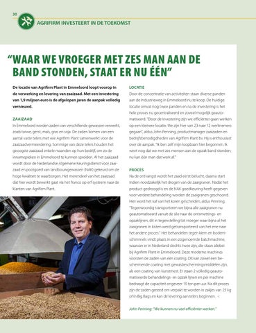 product gedroogd is en de NAK goedkeuring heeft gegeven voor verdere behandeling worden de zaaigranen geschoond. Hier word het kaf van het koren gescheiden, aldus Penning. “Tegenwoordig transporteren we bijna alle zaaigranen nu geautomatiseerd vanuit de silo naar de ontsmettings- en opzaklijnen, dit in tegenstelling tot vroeger waar bijna al het zaaigranen in kisten werd getransporteerd van het ene naar het andere proces.” Het behandelen tegen kiem en bodemschimmels vindt plaats in een zogenoemde batchmachine, waarvan er in Nederland slechts twee zijn; die staan allebei bij Agrifirm Plant in Emmeloord. Deze moderne machines voorzien de zaden van een coating. Dit kan zowel een beschermende coating met gewasbeschermingsmiddelen zijn, als een coating van kunstmest. Er staan 2 volledig geautomatiseerde behandelings- en opzak lijnen en per machine bedraagt de capaciteit ongeveer 19 ton per uur. Na dit proces zijn de zaden gereed om verpakt te worden in zakjes van 25 kg of in Big Bags en kan de levering aan telers beginnen. < John Penning: “We kunnen nu veel efficiënter werken.”