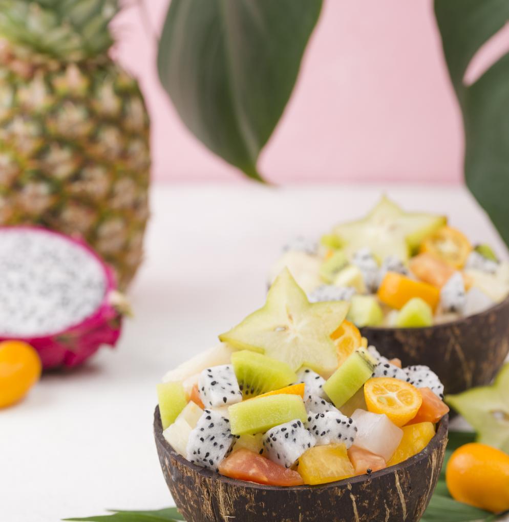 Tropical fruit products include mangoes, dragon fruit, bananas, cantaloupe, coconut, passion fruit, and seedless limes.