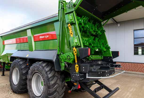 in terms of oil quantity and pressure, a double pump system with a maximum flow capacity of 385 l/min (165 + 220 l/min) is available. If the implement transfers a particularly high amount of heat into the hydraulic system or if the tractor is used in hot regions, an optional additional hydraulic oil cooler improves the hydraulic oil cooling capacity. In the rear, the optional FFC flat-sealing couplings for control units and the Power Beyond connection prevent the dirt ingress into the system as well as leakage oil and reduce pressure losses. The relieving rear power lift transfers weight from the implement to the tractor for optimum ground