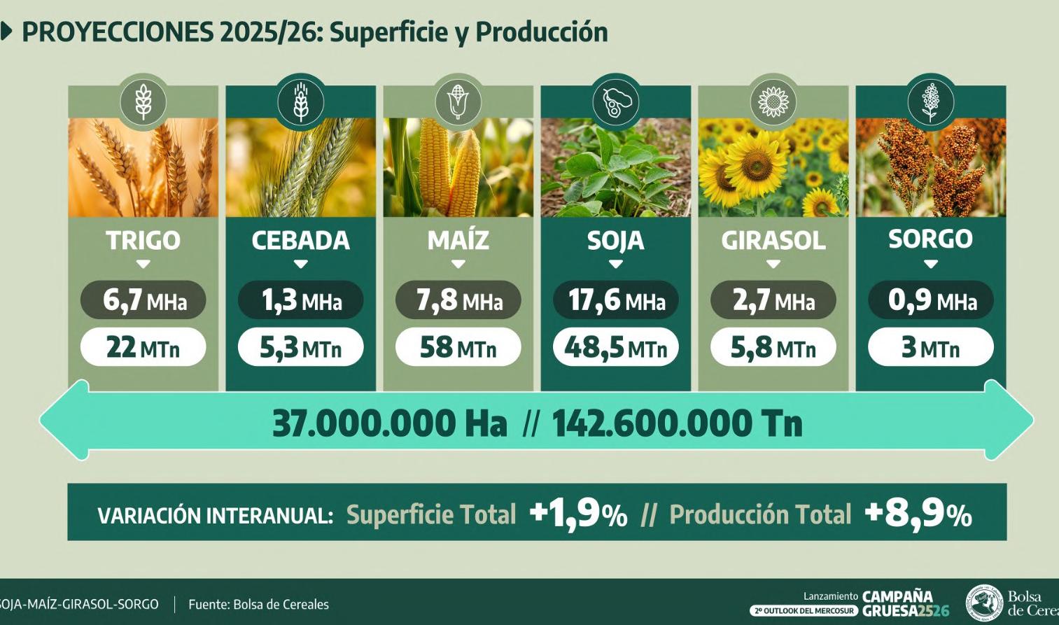 Bajo este contexto, Ramiro Costa, economista jefe de la entidad, destacó que la producción proyectada de 142,6 millones de toneladas para la campaña 25/26 representa un aumento del 8,9% respecto a la campaña anterior.