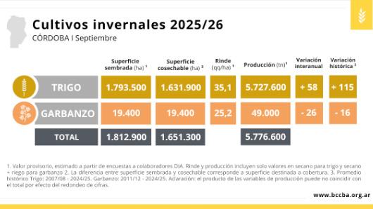 Las perspectivas son positivas para la campaña invernal 2025/26 según la primera estimación de producción en Córdoba. El trigo alcanzaría un rendimiento promedio de 35 qq/ha y 5,7 millones de toneladas (Mt), la mayor producción de la historia.