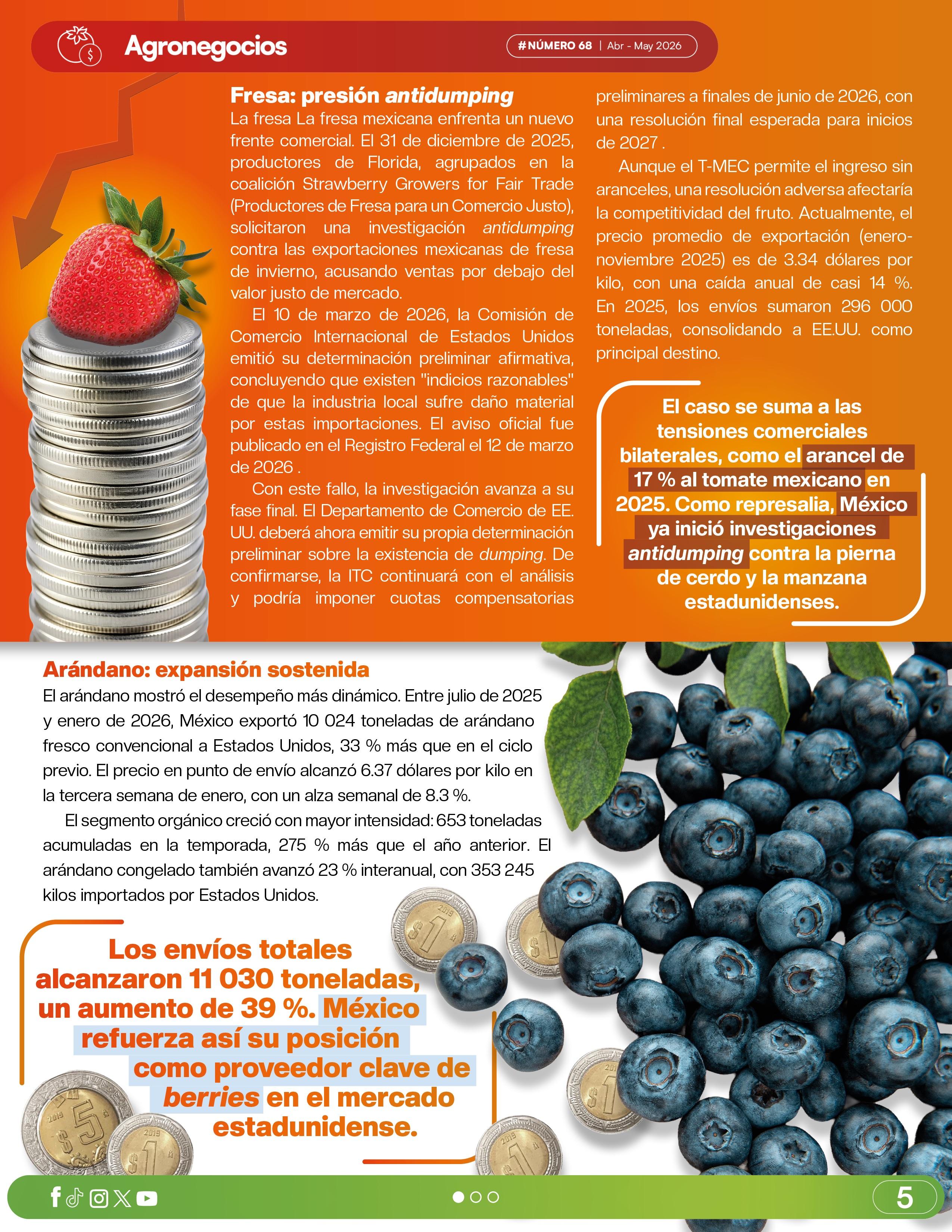 La reciente determinación de la Comisión de Comercio Internacional de Estados Unidos sobre la fresa de mexicana que entra en invierno al país vecino se suma a un escenario complejo donde el clima también juega su partida. A finales de 2025, productores de Florida acusaron a la fresa mexicana de posible dumping, de confirmarse tal acusasión, Estados Unidos podría imponer un arancel derivado del margen de daño que dictaminen.