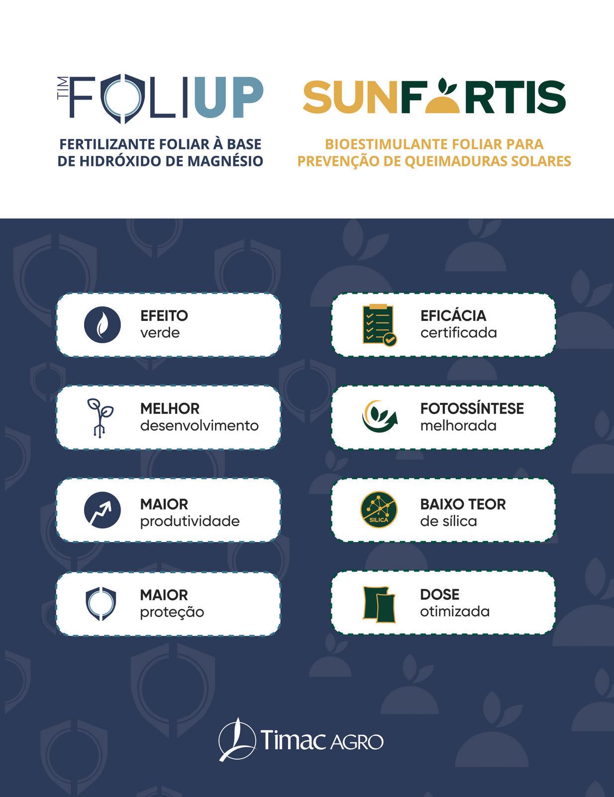 mento das plantas, mas também como fator-chave na sua resistência natural contra pragas e doenças, e é neste cenário que a Timac Agro tem vindo a desempenhar um papel de relevo, desenvolvendo soluções inovadoras que respondem às exigências atuais do setor e promovem uma agricultura mais equilibrada, produtiva e sustentável. Exemplo disso são as mais recentes inovações Timfoliup e Sunfortis, duas soluções formuladas, tendo como base o Magnésio — um elemento essencial para o equilíbrio fisiológico das plantas e a sua resiliência natural.