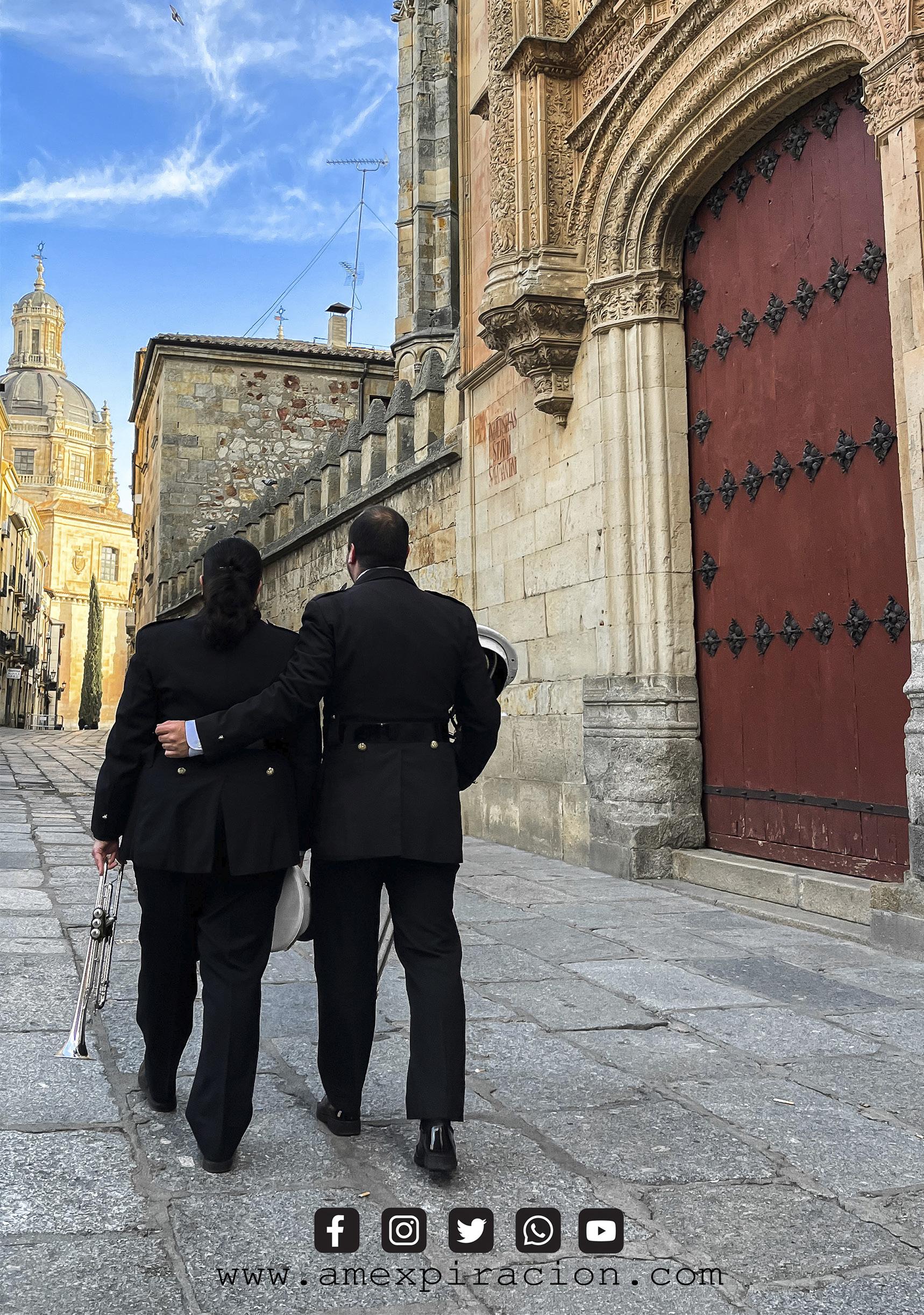 Fieles seguidores, acompañados de la música de agrupaciones como la que promueve esta publicación, la Banda la Expiración. Una música que enriquece y acompaña a las imágenes y los cofrades en su recorrido por el incomparable escenario que forman nuestras dos Catedrales, la Clerecía, la fachada plateresca de la Universidad, el barroco de nuestra Plaza Mayor, el convento de San Esteban o el milenario Puente Romano. Ninguna Semana Santa puede presumir de semejante entorno.