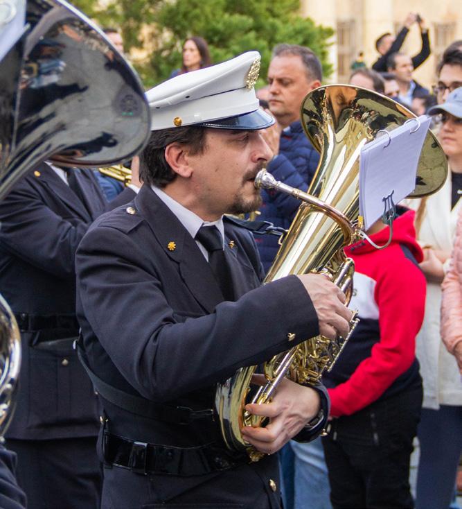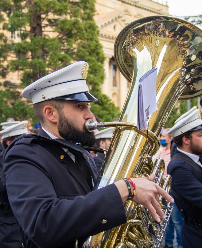 Enfocándonos en la materia de este tiempo venidero ya palpable en el ambiente, en este año 2023 se presenta una Semana Santa apasionante, pues las restricciones ya inexistentes, aquellas que tanto nos quitaron de nuestra semana de pasión, pero que también nos hicieron valorar y apreciar mucho más cada detalle, no mermarán el poder disfrutar de esta tradición centenaria que no es otra que la manifestación pública de fe en la Pasión, Muerte y Resurrección de Cristo. Hay que reconocer una vez más el gran trabajo callado que hacéis durante todo el año para que, con vuestros sones, nuestras sagradas imágenes tengan ese complemento perfecto a su hermosura. A día de hoy muchas imágenes no se conciben en la calle si no son acompañadas de esa música que marca el paso y el son de un andar que hechiza y embelesa. Si ya contamos con un alto valor escultórico en nuestra ciudad, acompañarlo de esas composiciones que erizan la piel hace que se revalorice aún más esta nuestra semana más ansiada. Hay que reconocer que la Semana Santa es arte, literatura, poesía, pintura, teatro, cine… y como no, música. Los sones con los que vosotros armonizáis los desfiles procesionales hacen que nuestra pasión entre por los cinco sentidos a las personas que nos acompañan desde la acera. También hacen que los sentimientos de nuestros cofrades, hermanos y congregantes ebullicionen exteriorizando lo que solo los que amamos esta bendita tradición podemos trasmitir.