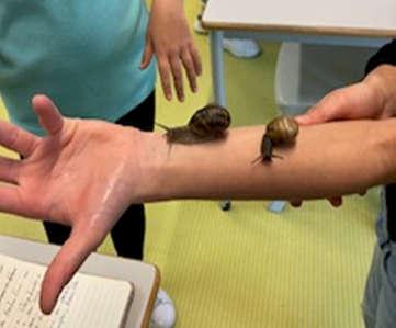 Aqui os alunos experimentaram nos seus braços o corpo mole do caracol, ou seja, um “pé” que lhe permite deslizar sobre o seu rasto de muco.