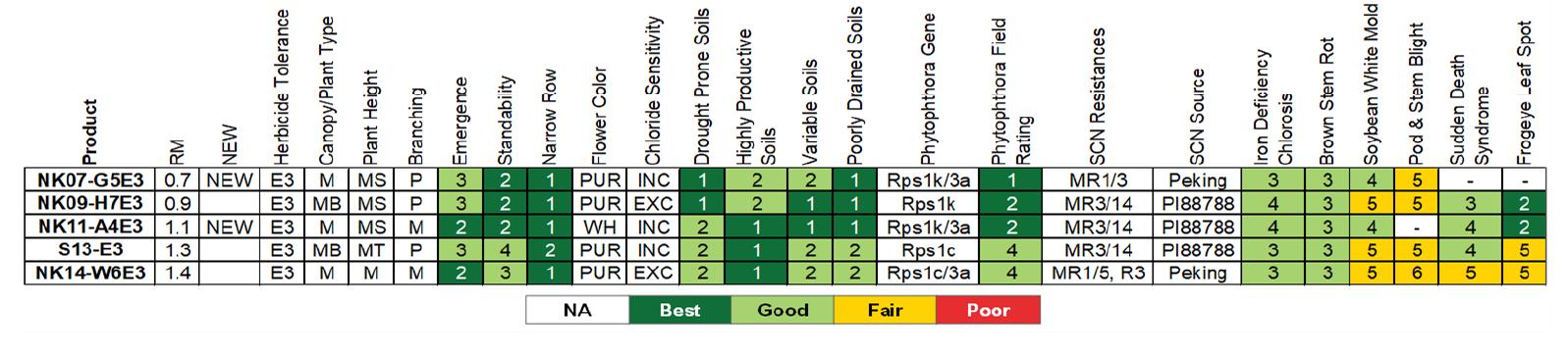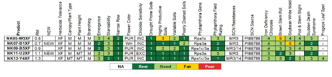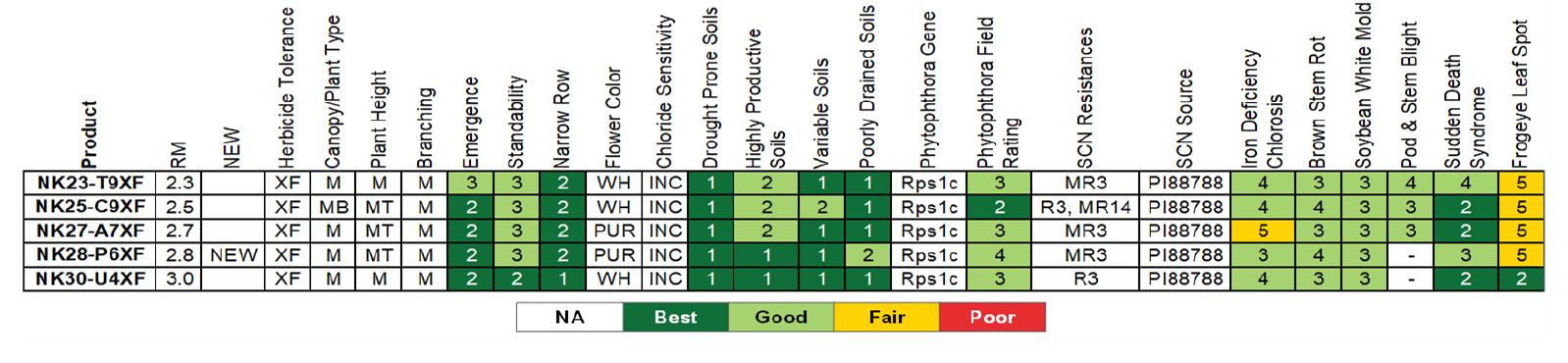 Variety Relative Maturity Herbicide Tolerant Trait New Flower Color Pubescence Color Hilum Color Pod Wall Color Canopy Plant Height Category Emergence Standability No-till Adaptability Iron Chlorosis Soybean Cyst Nematode PRR Resistance PRR Field Tolerance White Mold Brown Stem Rot Sudden Death Syndrome Chloride Sensitivity AG009XF3 0.09 XF P T BL B MB MT 2 5 3 5 R3 S 5 4 6 - Inc AG01XF3 0.1 XF P LT BL B MB MT 2 5 2 5 R3 Rps1c 4 5 - - Inc AG02XF2 0.2 XF P LT BL BR MB MT 1 3 2 4 S Rps1c 6 4 3 Inc AG02XF4 0.2 XF New P LT BL B MB MT 2 3 1 5 MR3 Rps1c 4 5 3 6 Inc AG03XF2 0.3 XF P T BL BR MB M 1 2 2 3 R3 Rps1c 6 4 6 Inc AG04XF2 0.4 XF P T BL BR MB T 1 4 2 4 R3 Rps1k 6 4 2 Inc AG04XF4 0.4 XF New P LT BL B MB MT 2 3 1 4 MR3 Rps1c 5 4 5 4 Inc AG06XF3 0.6 XF P LT BL B MB MT 1 3 2 4 R3 Rps1c 4 4 6 5 Inc AG07XF2 0.7 XF P LT BR TN MB MT 1 2 1 4 R3 Rps1k 5 5 2AG07XF4 0.7 XF New P LT BL B MB MT 1 3 1 3 R3 Rps3a 5 4 2 5 Inc AG09XF3 0.9 XF P T BL B MB MT 2 3 2 5 R3 Rps1c 5 4 4 6 Inc AG10XF4 1.0 XF New P G IB B MB MT 2 3 1 3 R3 Rps1c 4 4 3 5 Inc AG11XF2 1.1 XF P LT BR TN MB MT 1 3 1 4 R3 Rps3a 5 5 5 Inc AG12XF1 1.2 XF P LT BL BR MB MT 2 3 1 4 S Rps3a 4 4 3 6AG12XF3 1.2 XF P LT BL B MB MT 2 4 2 4 R3 Rps1c 5 5 2 5 Inc AG12XF4 1.2 XF New P G IB B MB MT 2 3 2 4 S Rps1c 5 4 4 6 Inc AG14XF4 1.4 XF New P G BF B MB MT 2 3 2 4 R3 Rps1c 4 4 3 5 Inc AG15XF2 1.5 XF P G IB BR MB MT 2 3 2 5 R3 Rps1c 5 5 3 6 Inc AG16XF3 1.6 XF P LT BL B MB MT 1 3 1 4 R3 Rps1c 5 5 3 3 Inc AG18XF1 1.8 XF P G BF TN MB MT 2 3 3 5 R3 Susc. 6 5 3 5AG19XF3 1.9 XF P G IB B MB MT 2 3 1 4 R3 Rps1c 4 5 2 3 Inc AG20XF4 2.0 XF New W LT BL B MB MT 2 3 1 6 R3 Rps1c 4 5 3 5 Inc AG21XF0 2.1 XF P LT BL BR MB MT 2 3 1 3 R3 Rps1c 4 4 3 3 Inc AG21XF2 2.1 XF P LT BR TN MB MT 2 4 2 4 R3 Rps3a 7 4 4AG22XF3 2.2 XF P LT BL B MB MT 1 4 1 5 R3 Rps1c 4 5 2 5 Inc AG23XF2 2.3 XF P LT BR BR MB MT 2 3 1 4 R3 Rps1k 4 5 2 5 Inc AG24XF1 2.4 XF P G GR TN MB MT 1 2 1 5 R3 Rps1c 5 4 3 4AG24XF3 2.4 XF P G IB B MB MT 1 3 1 5 R3 Rps1c+Rps3a 5 6 3 4 Exc AG24XF4 2.4 XF New P G IB B MB MT 2 3 2 5 R3 Rps1c 5 4 TBD 4 Exc AG25XF3 2.5 XF P G IB B MB MT 2 2 1 6 R3 Rps1c 4 5 3 5 Inc AG26XF1 2.6 XF P G GR TN MB MT 2 3 2 4 R3 Rps1c 6 5 2 4AG27XF3 2.7 XF P G IB B MB MT 1 4 1 4 R3 Rps1c 5 5 3 6 Inc AG27XF4 2.7 XF New P G IB B MB M 2 3 2 6 S Rps1c, Rps3a 5 4 TBD 4 Inc AG28XF3 2.8 XF P LT BL B MB MT 2 4 1 6 R3 Rps1c 4 5 3 5 Inc AG29XF4 2.9 XF New P LT BL B MB MT 2 4 3 4 R1,R3 Susc. 5 6 TBD 6 Inc AG30XF4 3.0 XF New P G IB B MB MT 2 1 1 5 R3 Rps1c 4 4 2 4 Inc