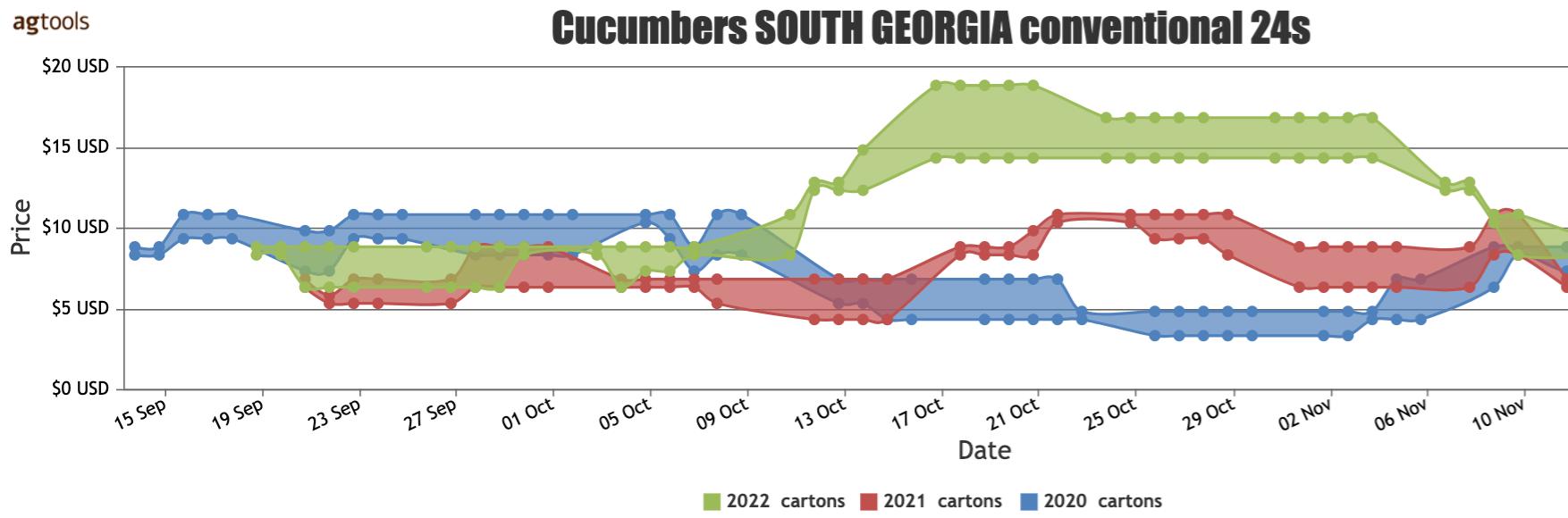 Georgia shows pricing starting at 2020 levels until early October when there is a steep price hike that continues all the way through November. This price hike is significantly higher than the prior two years.