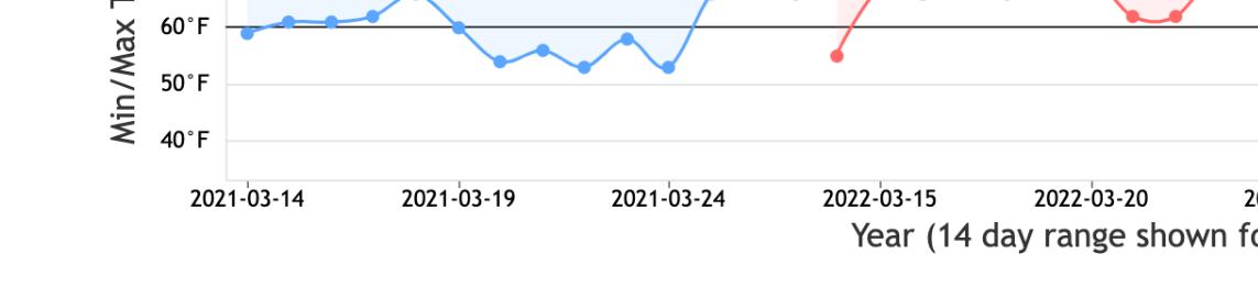 Shows the 14-day forecast for cucumbers grown in Collier, Florida. The temperatures between March 14 – 25 are very favorable, indicated by the green shaded days. The temperature falls within the ideal minimum and maximum range. Also noted are the number of days with rain, every day with the exception of March 16 – 17. The comparative weather graph also shows favorable temperatures over the last three years 2021 – 2023 for growing tomatoes in this region. The temperature for all three years falls within the ideal minimum and maximum range.