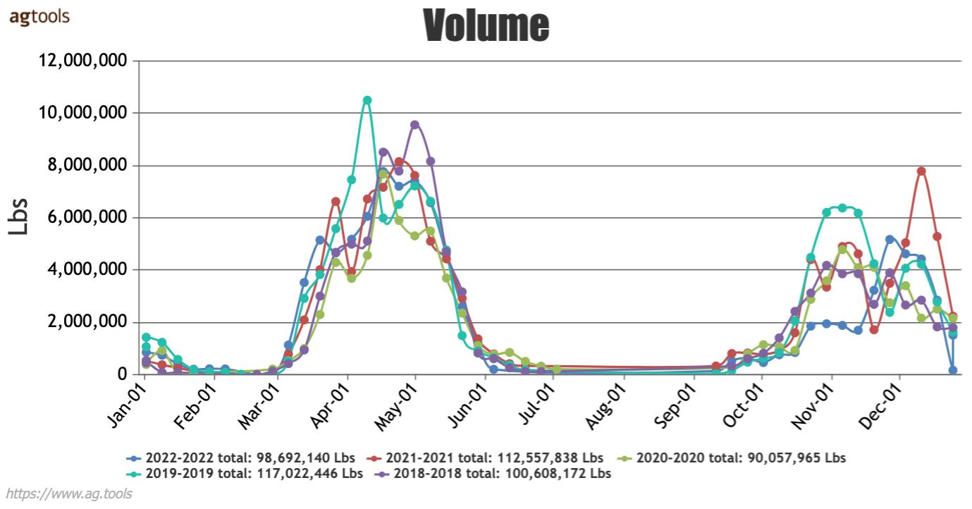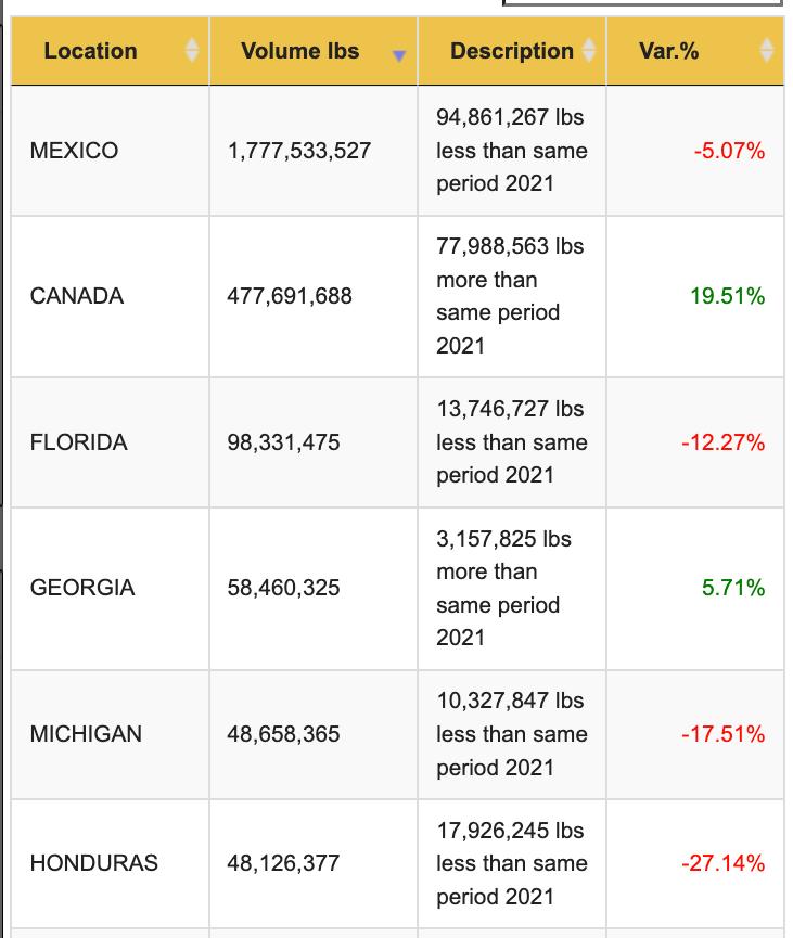 Mexico began 2022 at a higher volume level than prior years but lost steam with a government order halting Mexico avocado shipment to the U.S. market in February, beyond that the volume trends closely mirrored the prior year. That government order could have resulted in the -5% loss as the prior year Mexico had a volume increase of 21%