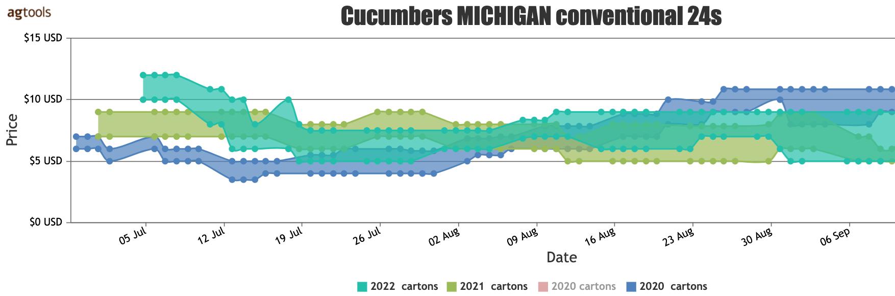 Compares three year’s of FOB pricing for two timeframes from two different regions for conventional 24’s from two different regions, Michigan and Georgia. Michigan shows a higher FOB price at the beginning of July returning to 2021 levels and continuing to trend with 2021 through the end of September.