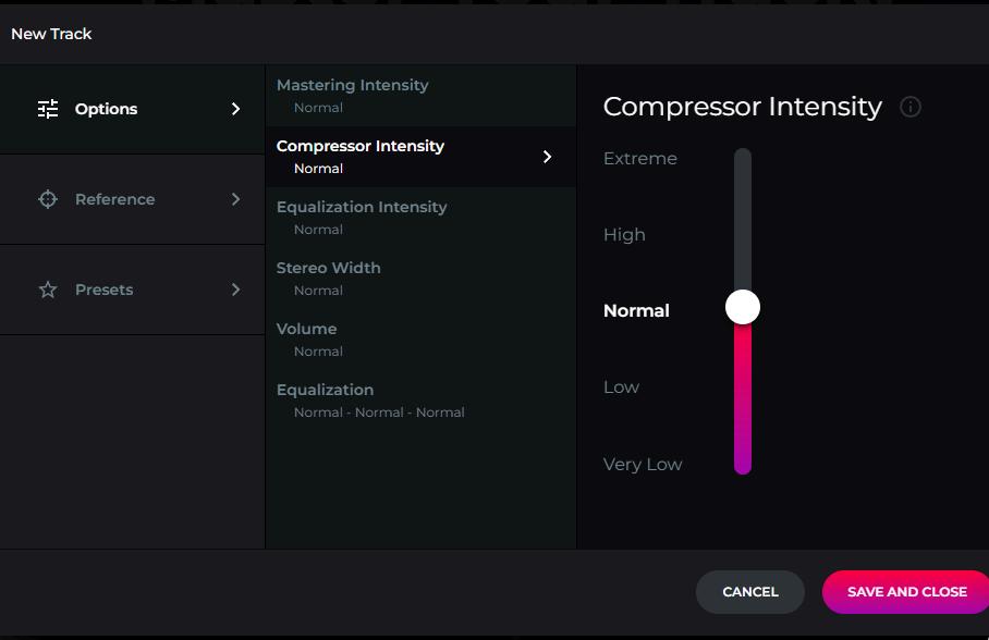 Con esta plataforma puedes lograr notables mejorías en tus proyectos musicales. Puedes configurar diversos parámetros, e incluso puedes subir otro track de audio previamente masterizado para usar como referencia Ejemplo: subo una canción de estilo latino para ser masterizada y como referente subo otra canción que me parece que está masterizada como a mi me gustaría que quedara la nueva canción.