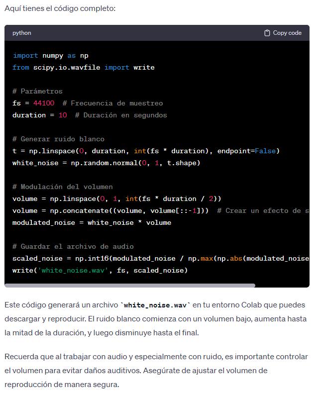 Otra opción, con menor calidad sonora (de momento), pero que tiene un gran potencial de desarrollo (mucho más allá de la tarea de este ítem), es usar chatGPT para generar un código de programación en Python, para crear el audio deseado. Google Colab es una plataforma online que permite ejecutar líneas de código en Python, usando la capacidad de procesamiento de Google