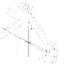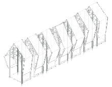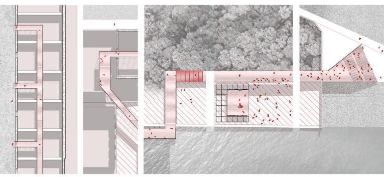 Unión de los 7 pórticos, siendo el primero, el cuarto y el séptimo iguales, y el segundo, tercero, quinto y sexto también iguales, se van rotando para generar el movimiento mencionado. Se unen a través de un tablero en el suelo que unifica toda la intervención.