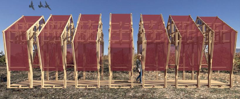 Tomando el arquetipo y espíritu de estas estructuras sagradas, nos propone mos construir un camino de arcos que simbolizan la apreciación por paisaje de la viña y las montañas, el paso hacia un estadio de tranquilidad y paz que lo gramos cuando nos sumergimos en la naturaleza, valorándola y respetándola. La construcción se hace con una estructura de madera y telas que proveen de sombra para quienes deciden hacer una pausa en su recorrido por la viña, per mitiendo apreciar su paisaje. Los arcos van variando su forma simbolizando la transformación de la naturaleza (y de nosotros mismos que somos parte de ella) con el correr del tiempo.