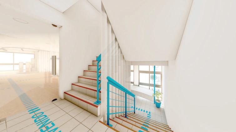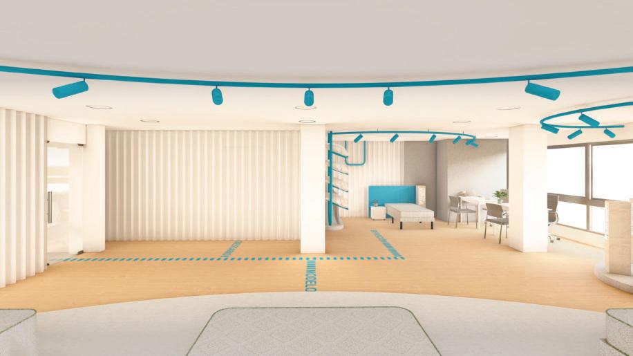 coloca un cartel con soportes tubulares del mismo estilo utili nombre de la marca en vertical. Se pinta un pequeño “basamento” turquesa y se mantiene el resto de color blanco, para generar cimientos de la fachada. Por último, se pintan las rejas de celeste turquesa, y se colocan vinilos sobre uno los ventanales marca “abri, desplega, disfruta”. A través de los ventanales, colchón “flotante” en el rellano de la escalera, en conjunto con