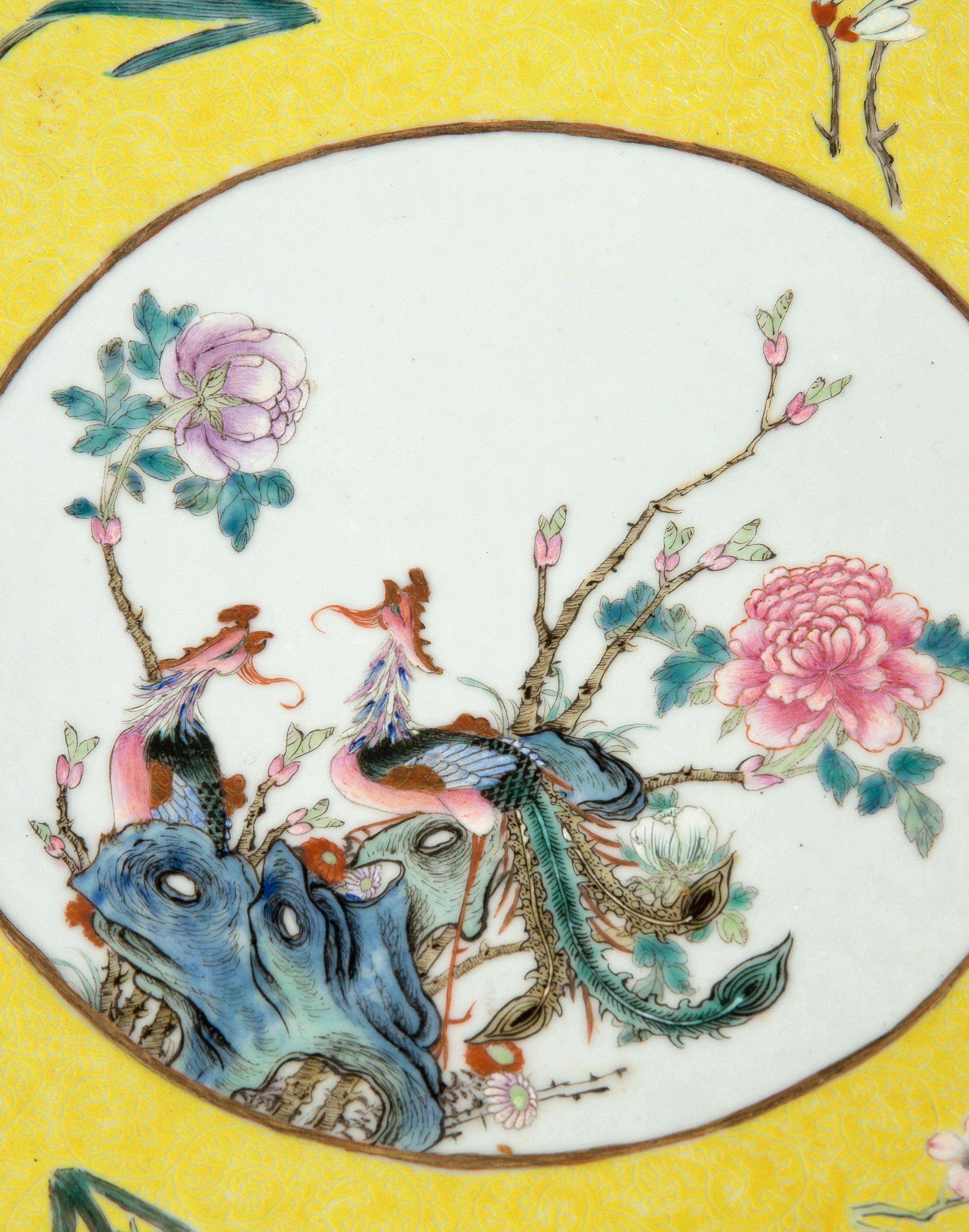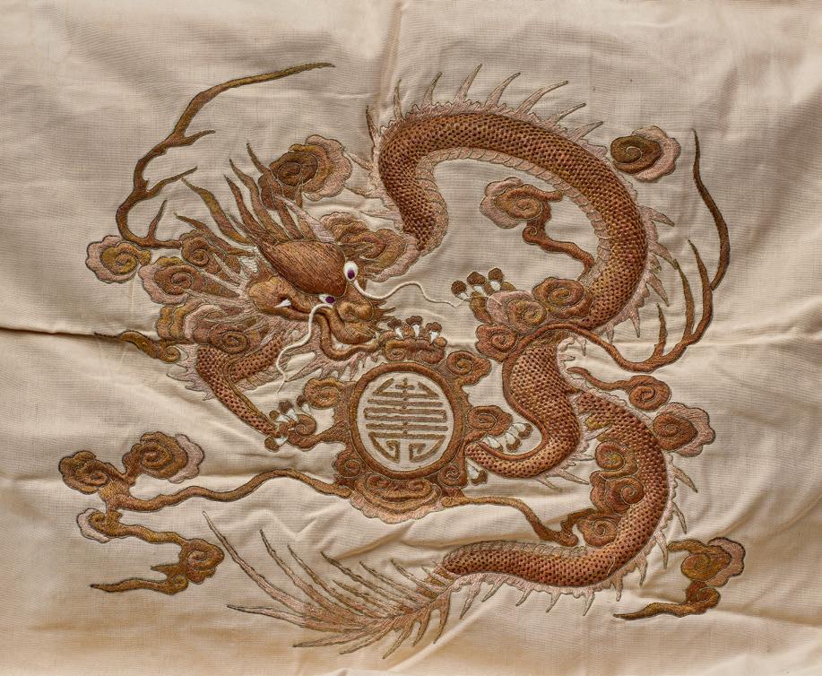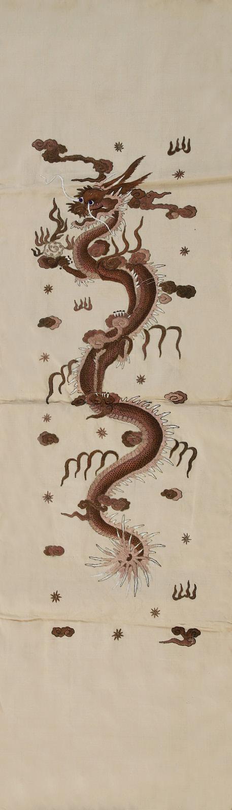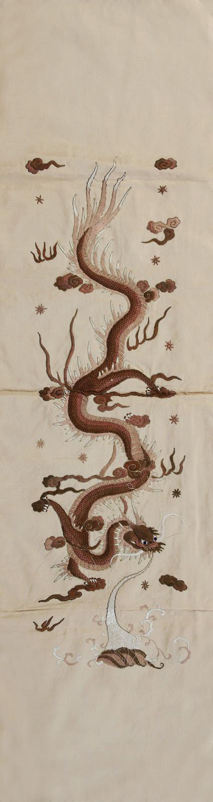 Importante tenture brodée décorée d’un tigre et d’un kirin parmi les pivoines et les rochers, avec deux phénix volants parmi les nuées.