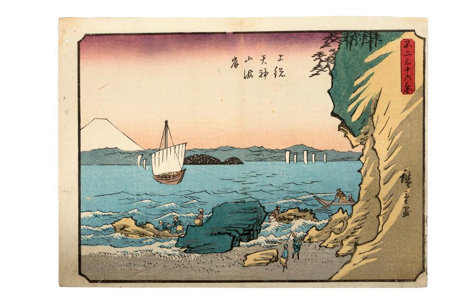 Trente-et-un chuban yoko-e de la série Fuji Sanjurokkei (« Trente-six vues du mont Fuji ») par Sanoki (Sanoya Kihei). Cachets de censure Murata Kinugasa. Cachet année Rat 12.