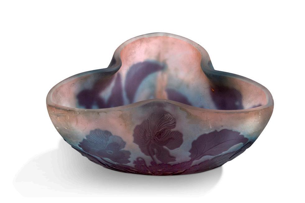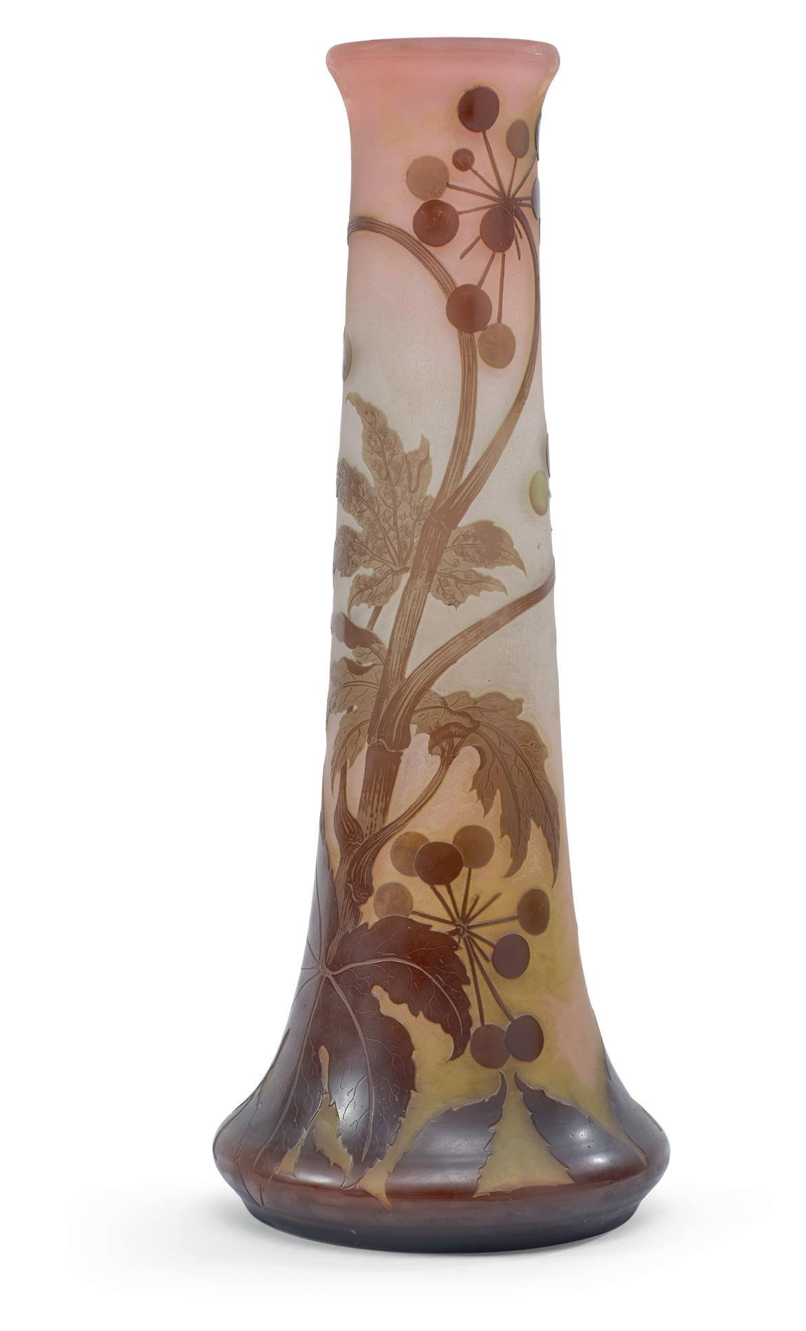 A multi-layered glass ‘aux corbeaux’ vase, c. 1900, with acid-etched and enamelled decoration. Signed.