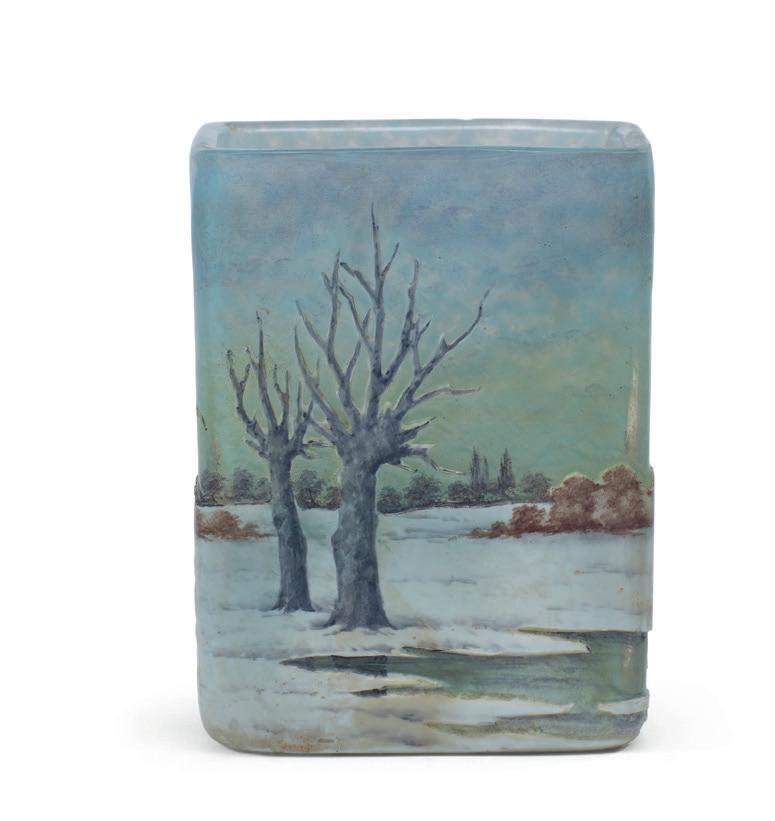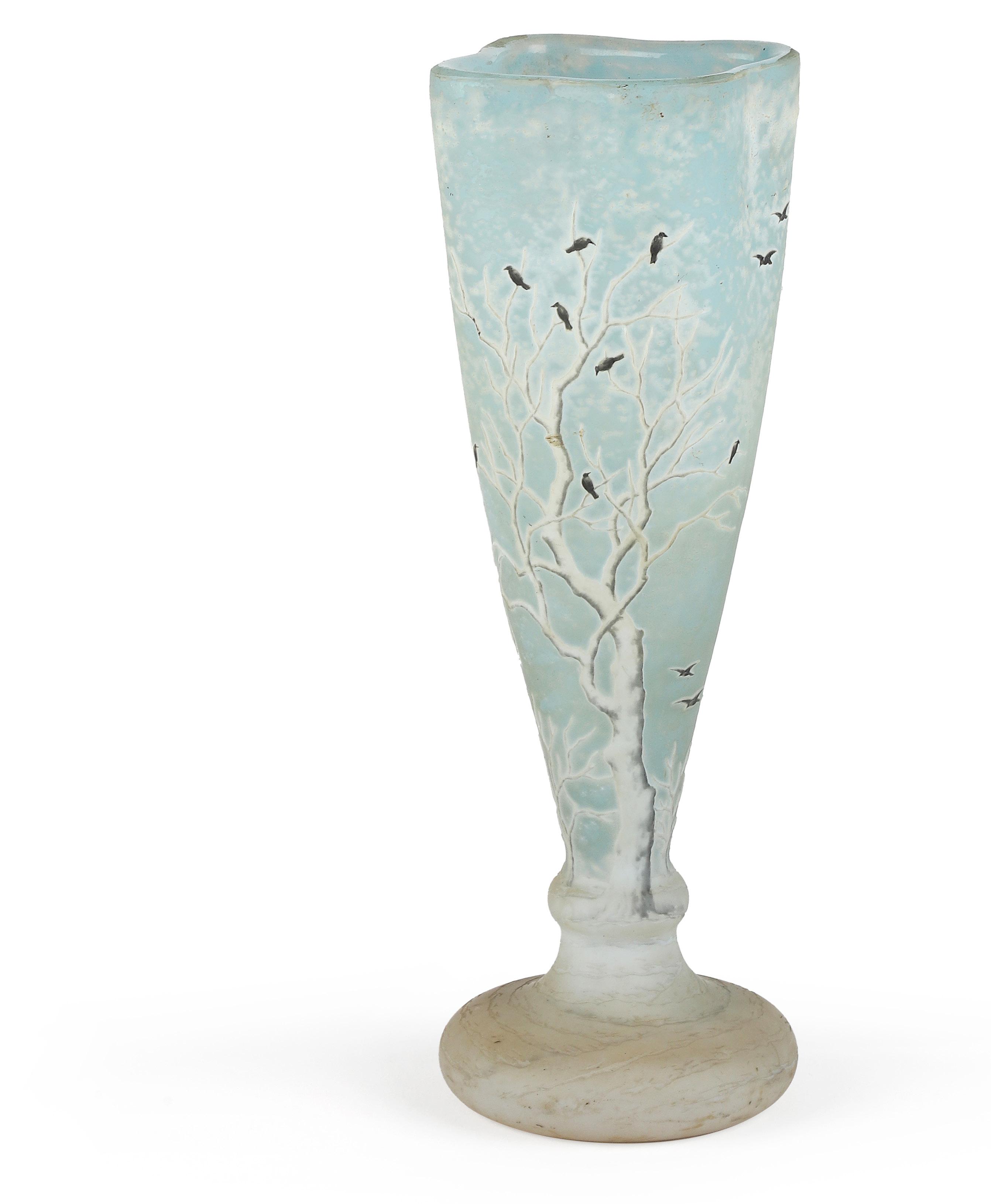 Rare vase ‘aux corbeaux’, circa 1900. Le col quadrilobé, en verre multicouche sur fond bleu ciel nuagé, à décor gravé à l'acide et émaillé de corbeaux volant ou posant sur des arbres enneigés.