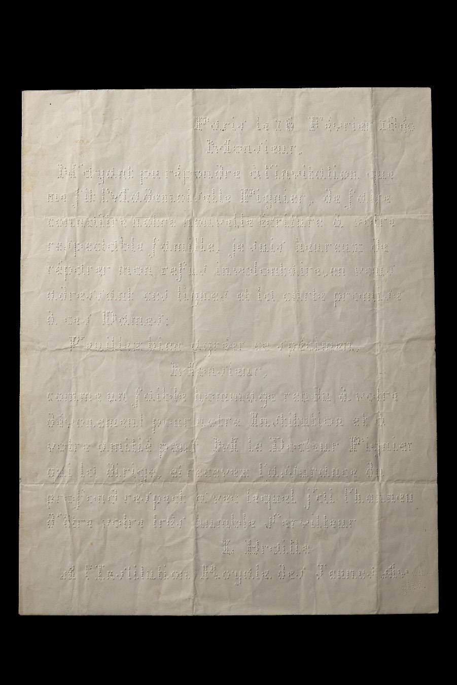 Tirage contretype argentique postérieur, probablement des années 1910, monté sur carton. Sur verso, légende, annotation manuscrite et une signature. Sur recto, nombreux manques sur le visuel, taches, traces et rayures sur le visage.