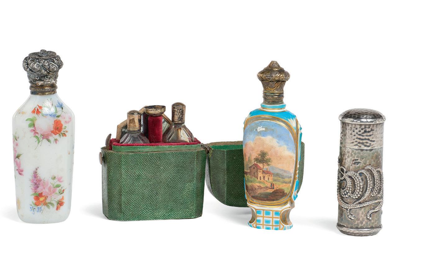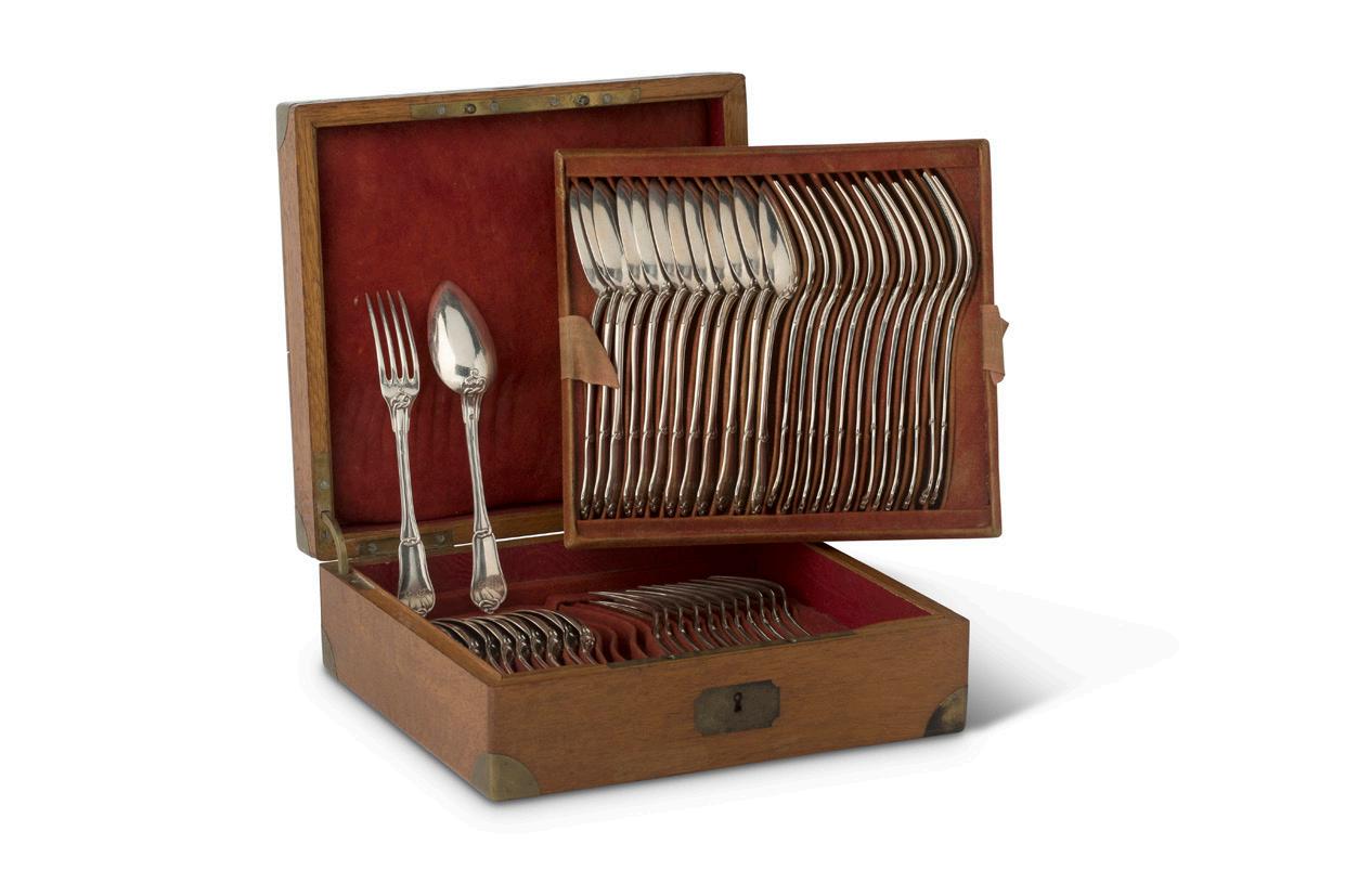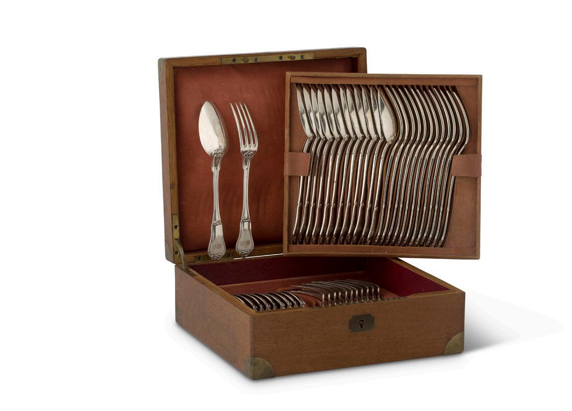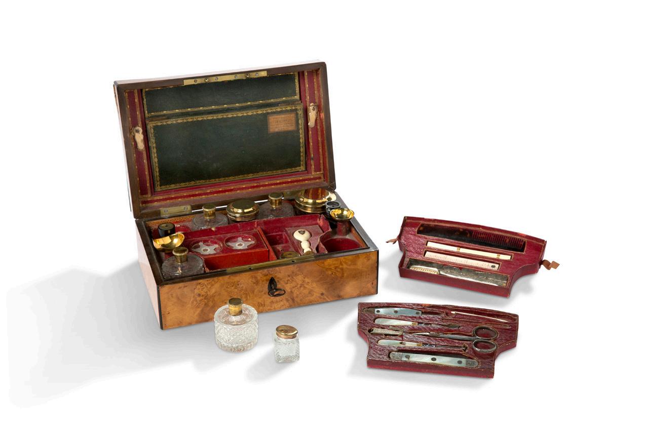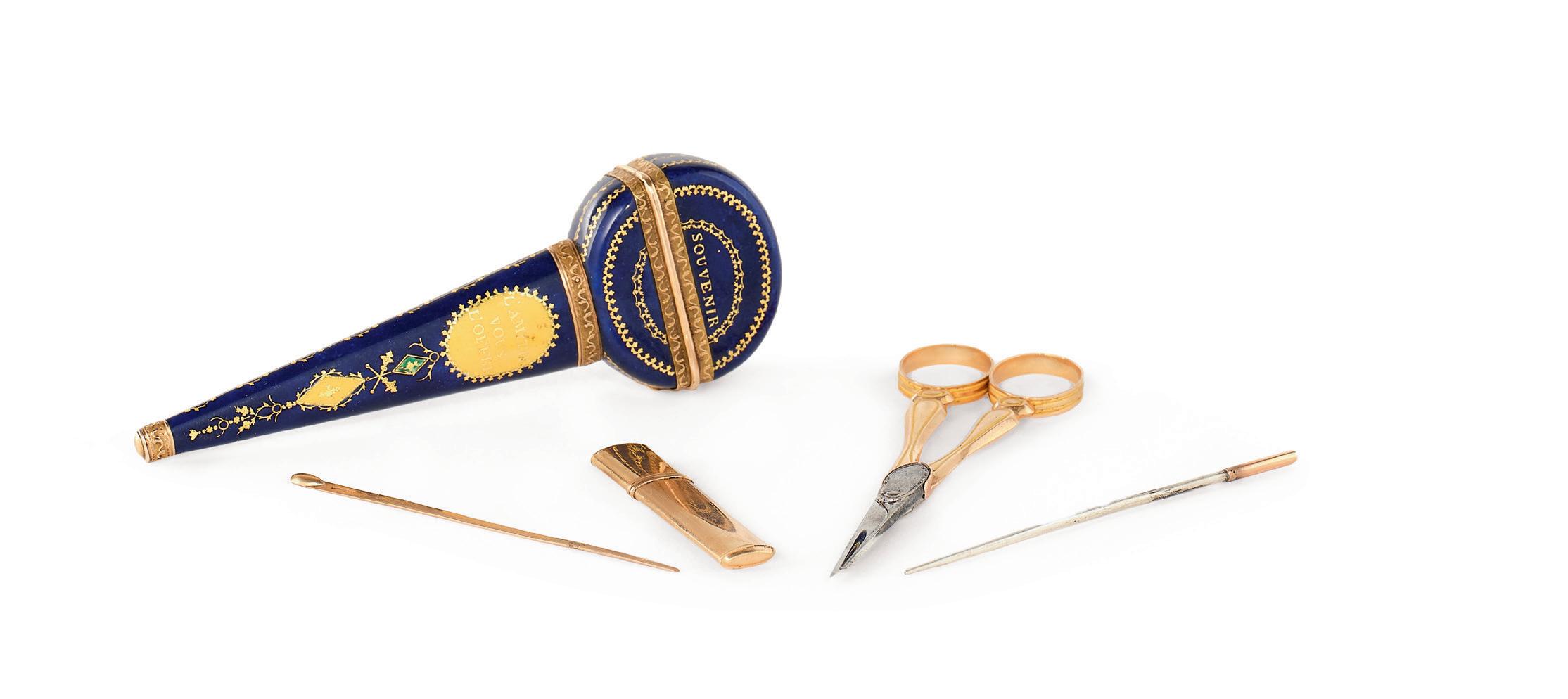 On y joint un nécessaire de voyage en argent comprenant des petits ustensiles divers. XVIIIe siècle.