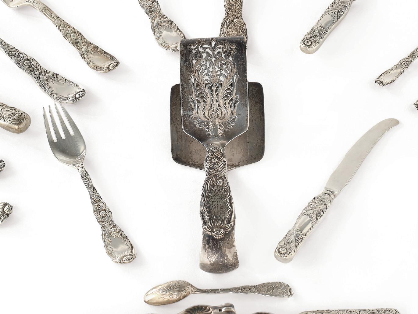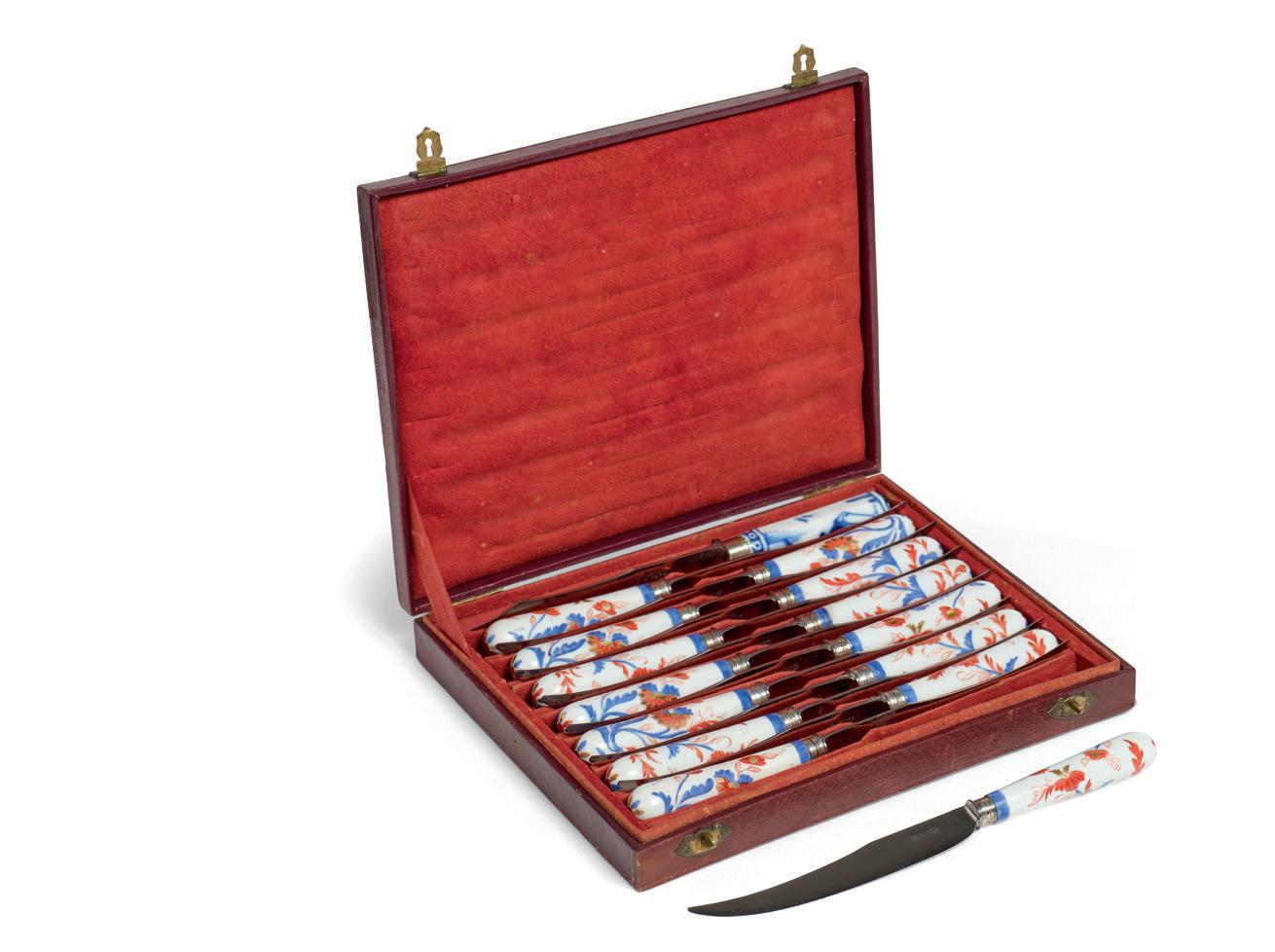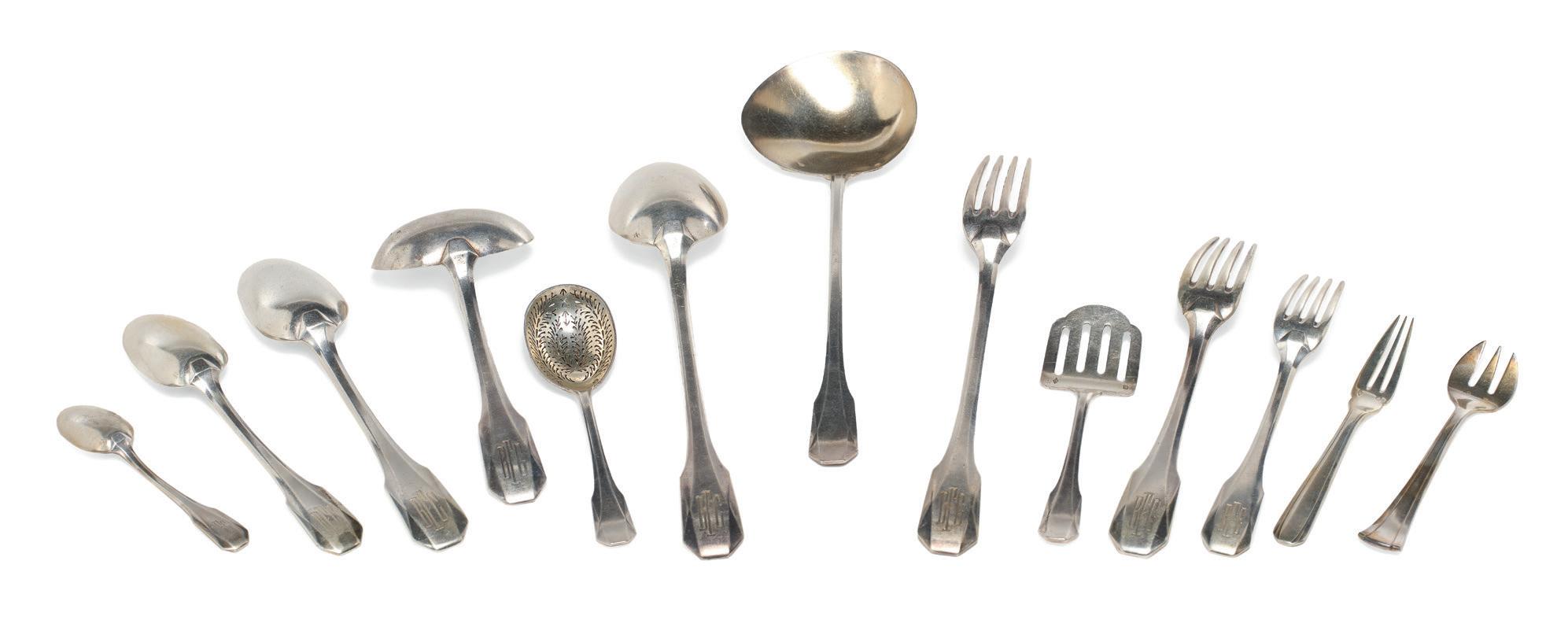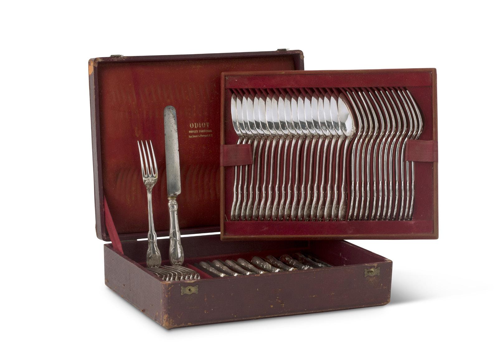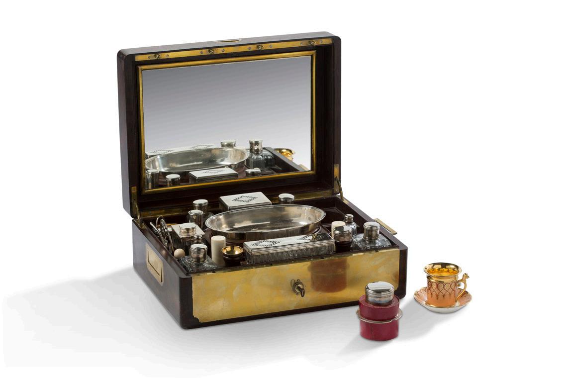 On y joint un nécessaire de voyage en argent comprenant des petits ustensiles divers. XVIIIe siècle.