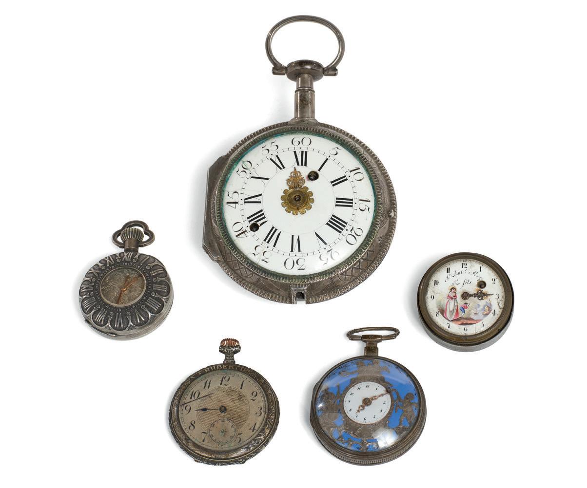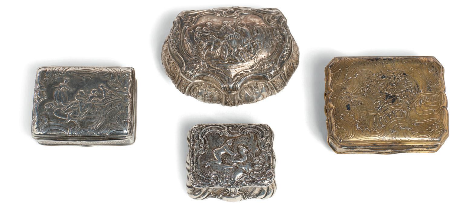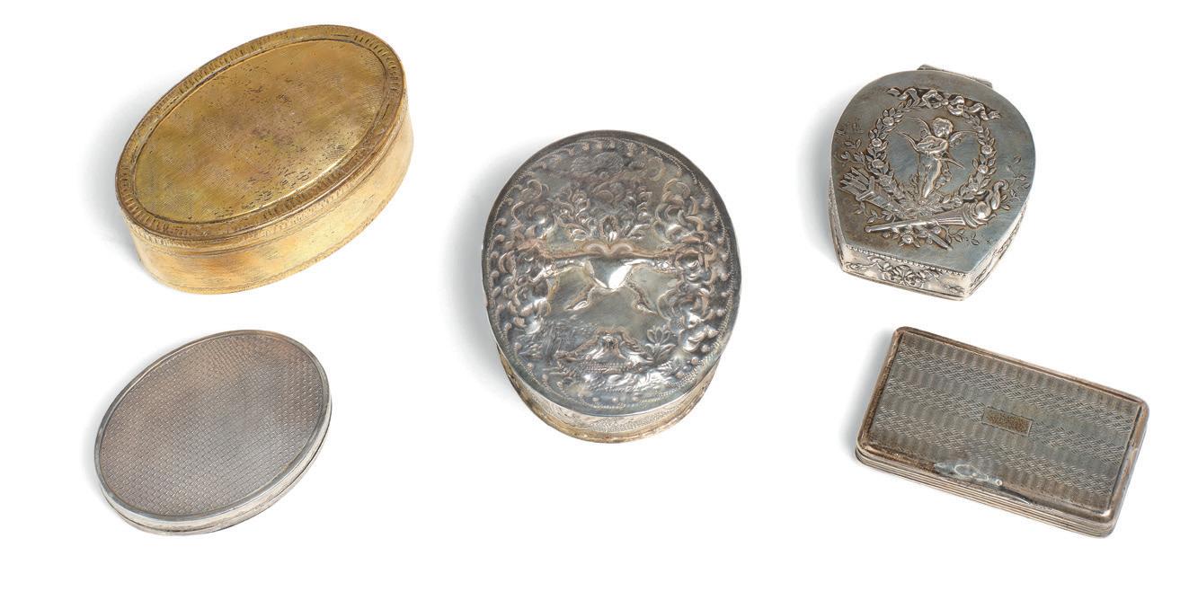 Une boîte ovale en cuivre doré XVIII e ; une boîte « de mariage » ovale en argent repoussé Pays-Bas XVIII e, un boîte à aiguilles en métal argenté, une boîte ovale guillochée d’argent XIXe et une boîte en forme de fer à cheval en argent étranger XIXe