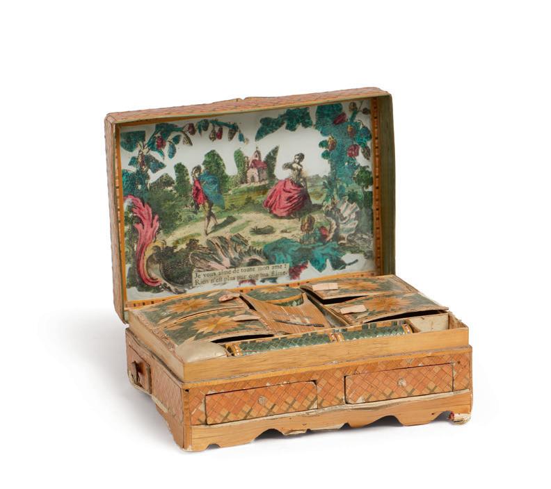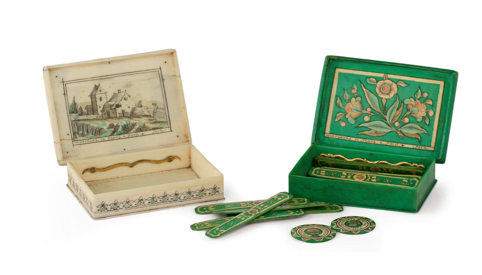 DEUX BOÎTES DE JEUX DE QUADRILLE par Mariaval le Jeune à Paris, en plaques d’os de baleine teinté et nacre sculptée et gravée inscrustée. Le couvercle à système de comptage et décor de personnages de la comédie italienne. L’intérieur à scène champêtre et fleurs. Les deux signées. Au dessous, respectivement une ottomane fumeuse et un papillon. La boîte verte contenant quinze rectangles de comptage décorés et deux jetons portant les inscriptions « Je ne suis point ouverte » et « J’attens ma couronne ». Paris, début du XVIIIe siècle, vers 1720.