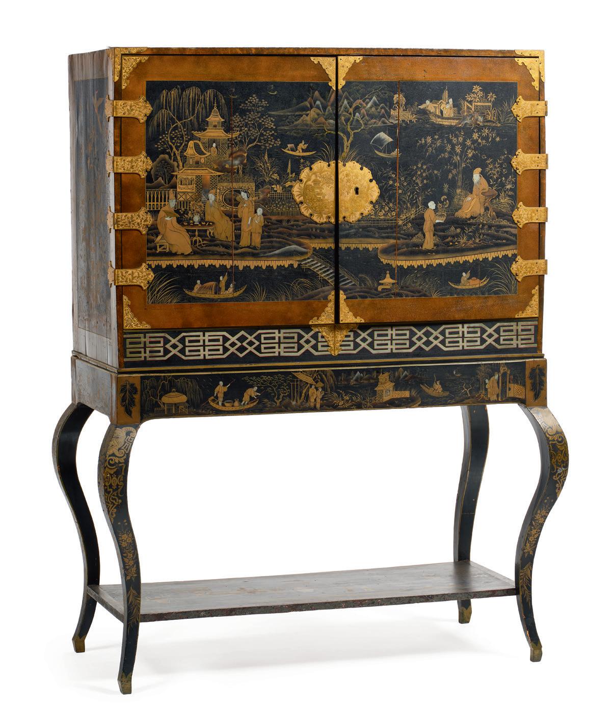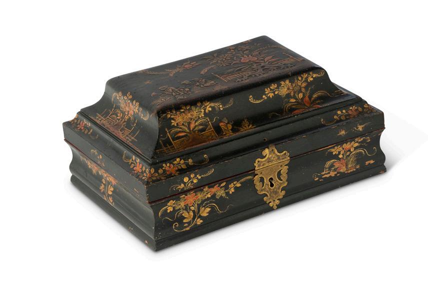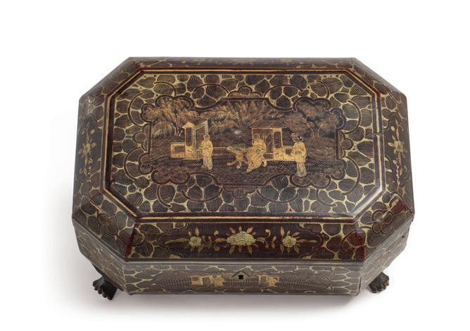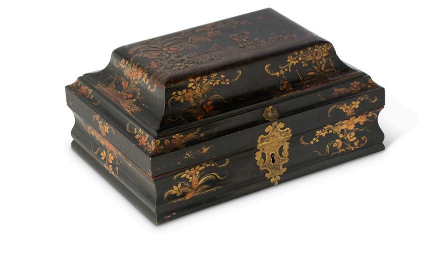 en bois laqué, le couvercle en doucine à décor laqué de scènes chinoises en or sur un fond aventurine. Entrée de serrure et charnières en laiton gravé, XVIIIe siècle.