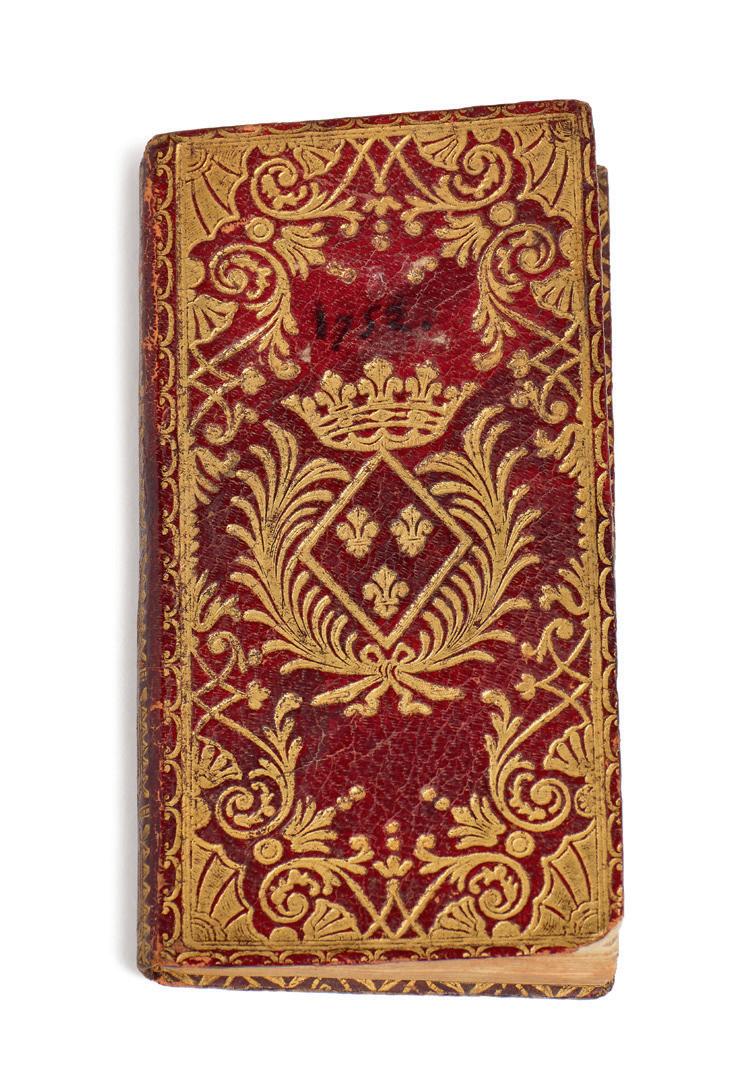 Paris, Veuve J. F. Collombat, 1752. In -12, maroquin rouge, fine plaque dorée à encadrement, aux angles fers à la toile d’araignée, aux armes de Mesdemoiselles de France, de filles Louis XV, dos doré au petits fers.